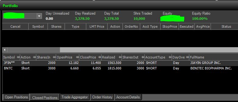 BNTC also amazing setup as the premarket show a clear setup like Stairs. I was waiting for the bump in the morning as It was supposed to jump up to the last premarket spike, but it didn't, it had extremely difficulty to jump. I placed a short limit at 6.32$ after the first few minutes and it cracked those limits. Should had hold it longer as it was failing and liquidity was fading as well, but I reached my daily goal and I was happy mostly because I placed the right setups.