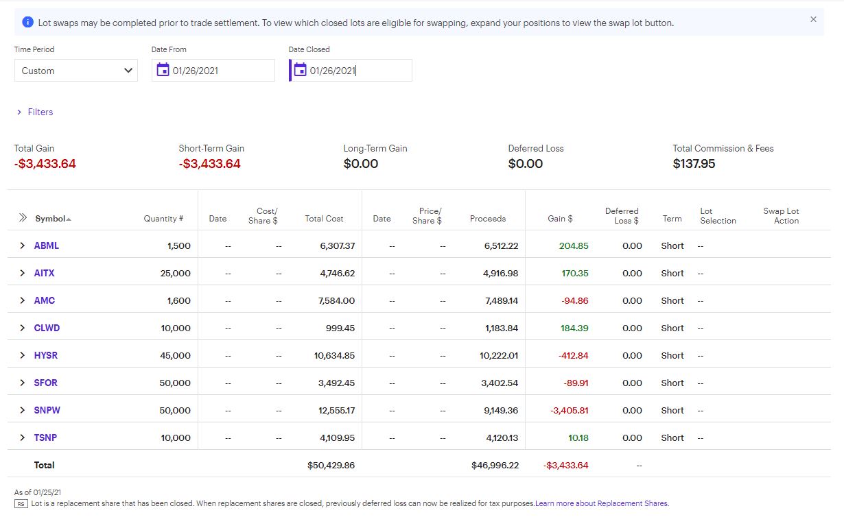Stepping away temporarily. Could say I already blew up. Despite the profit shown here on profitly, it doesn't account for the commissions and fees etc on etrade. Even after over 580+ trades I still was still repeating mistakes. Going to take some time studying more and make a plan when I come back to stock trading. Day trading is ridiculously hard. I thought I could succeed "quickly" just because I had a quirk for t/a, f/a, extremely proficient with computer/tech, meticulous, observant, and much more. I saw a tweet today from a trader which said: "If you don't take it seriously with the little $$$ you're starting with, you won't take it seriously with a lot of $$$". Which was dead true with me. Many times when I had small positions or anything under $1k in a stock, I tended to not care as much and saw it as a experiment. Disregarded any large % gain. Even with $500, I wouldn't cut my losses even if I was down 10%-50%. I'd just watch. Anyways, going to take a few months off from stocks / day trading. Currently investing in Crypto. Supposedly this is the bull run year since 2017. Don't want to miss it.