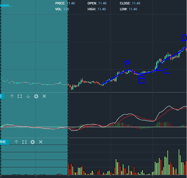 The second ABCD pattern formed at 10:24 AM Colorado time. this was the biggest move of the day, buy level would be 15.40. Risking off 15.02, the high was 18.63. For new traders like me, I placed a hard stop on the risk level, and a use a stop order to enter the trade. I like to use a trailing stop once I am in the trade and it is moving in my direction, (sometimes this gets me out too soon) but if done right I am almost always taking profits. As the trade gets closer to my profit target I will shorten the trailing stop % ie., I start off with a 5%-10% trailing stop if I am looking for a gain of 10% on the chart based on volume, float and so on I will start to reduce the trailing stop from 10% to 7%, then 5%, then 4% and so on until I am out. This strategy can leave a lot on the table but it also protects my loss.