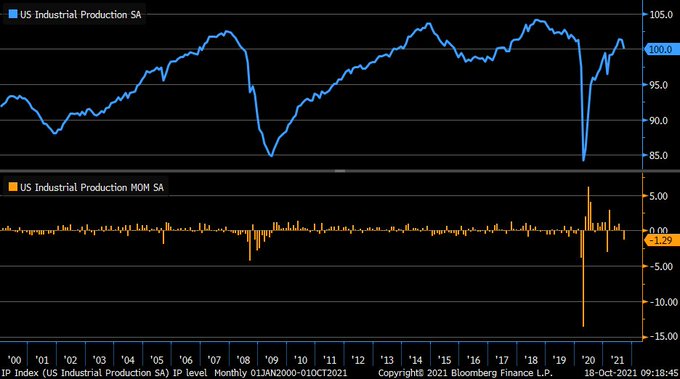 Industrial production weaker in September, -1.3% vs. +0.2% est. & -0.1% in prior month (rev down from +0.4%); worst monthly decline since February’s -3% … factory production -0.7% vs. -0.4% prior; utilities -3.6% and mining -2.3%