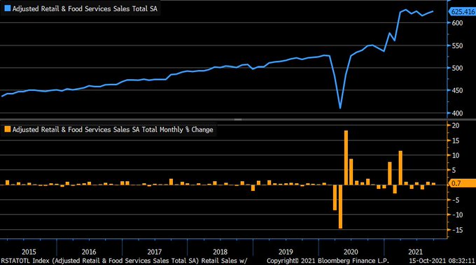 September retail sales +0.7% vs. -0.2% est. & +0.9% in prior month (rev up from +0.7%); sales ex-autos +0.8% vs. +0.5% est. & +2% in prior month (rev up from +1.8%)