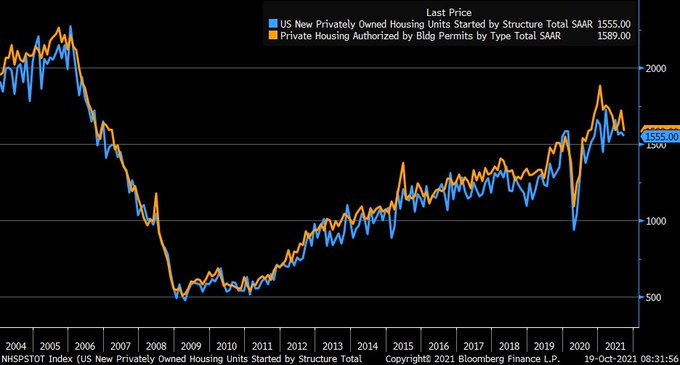 September housing starts weaker at -1.6% vs. -0.2% est. & +1.2% in prior month (rev down from +3.9%); building permits -7.7% vs. -2.4% est. & +5.6% in prior month (rev down from +6%)