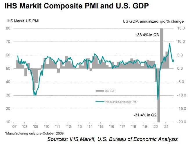 October @IHSMarkitPMI mixed: Mfg dropped to 59.2 vs. 60.5 est & 60.7 prior, but Services rose to 58.2 vs. 55.2 est & 54.9 prior…lift from latter brought composite measure up to 57.3 vs. 55 prior; despite ongoing supply pressure, employment grew at fastest pace since June