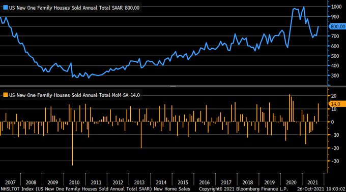 Quite the pop in September new home sales, +14% (largest gain since July 2020) vs. +2.5% est. & -1.4% in prior month (rev down from +1.5%); median new home price +18.7% y/y; months’ supply down to 5.7 vs. 6.5 prior