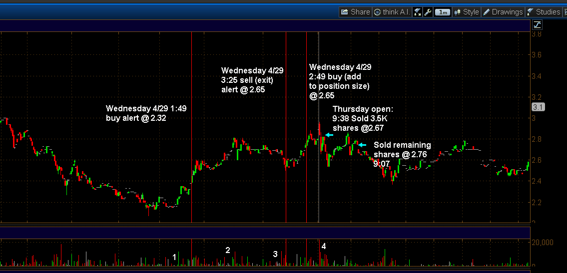 The first alert at 1:49 (Buy @ 2.32) comes out. Again, trying to get into Tim's brain here....Why did he enter here? Take a look at the volume spike at #1. This is the largest volume spike of the day (I've mentioned volume spikes -slam bars- previously in the blog and probable trend changes when they occur) after the news release (I think) so this might have been the ingredient to click the mouse. The bounce was an almost round number off of 2.05 so that never hurts as another 'reason' to enter either. Price ticks up to 2.80 and knocks on that door twice. Look at #2 in the volume graph. Another high red slam bar followed by more selling without much buying volume. At point #3 another high volume spike and then the alert at 3:25 comes out to sell some (not all) of the initial position. I am thinking that Tm might have exited the entire position if 2.50 would have been broken to the downside or would have at least been ready to if there was no bounce from 2.50 which did happen but not in a real high volume way. Towards the end of the close of the day, price firms up and the 3:49 alert (chart text says 2:49-incorrect) and he adds to his position size like we have seen many times before - strength into the close per good earnings/news to look for a spike after hours or open on next day.