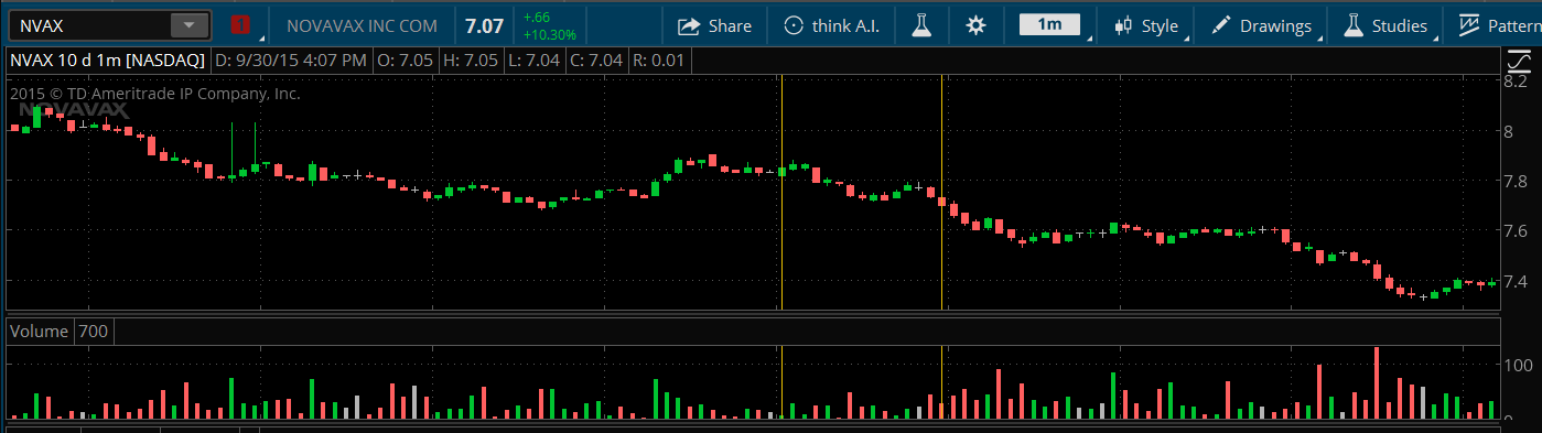 NVAX from 9/29. NVAX had good news about getting a grant and good volume and movement pre-market. There was a morning spike down then a double top after the open then down again. NVAX is shortable on TOS but I was simply hesitant to short this on good news. I think I just stopped watching it after the double top. I kept it on my screen and saw the volume picking up around 12:20 CST, then the dip, then the return up and buy. I was thinking that the good news has to start moving this thing at some point so this might be it...nope. The second vert line is where I got out when that support was broken. About another $200 loss. What did I do wrong?