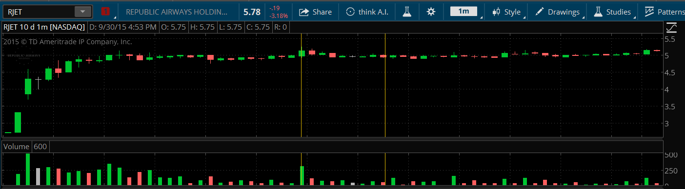 RJET from 9/28. This is zoomed in a lot to be able to see the price action a little better. This was after the news spike and the chat room heated up. The first yellow vertical line is where I entered with the volume thinking that price was going to break out of the channel and then exited on the second vertical line when I thought that things were getting weak. This was about a $200 loss I think and it was a DUMB trade because: