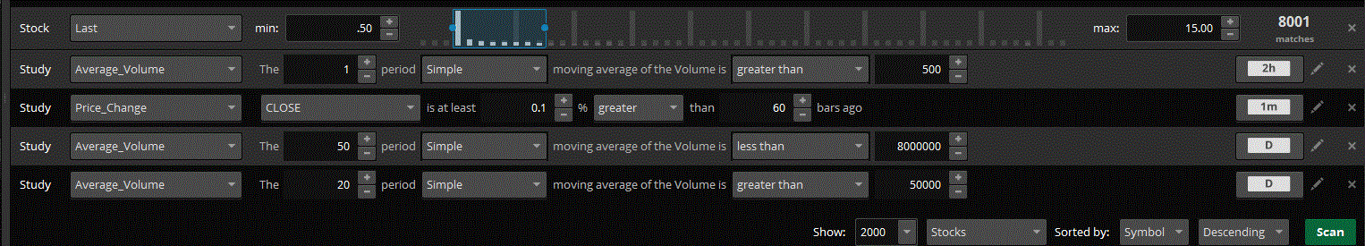 That is the part you need to alter along with the 2hr volume period with at least 500 shares traded.