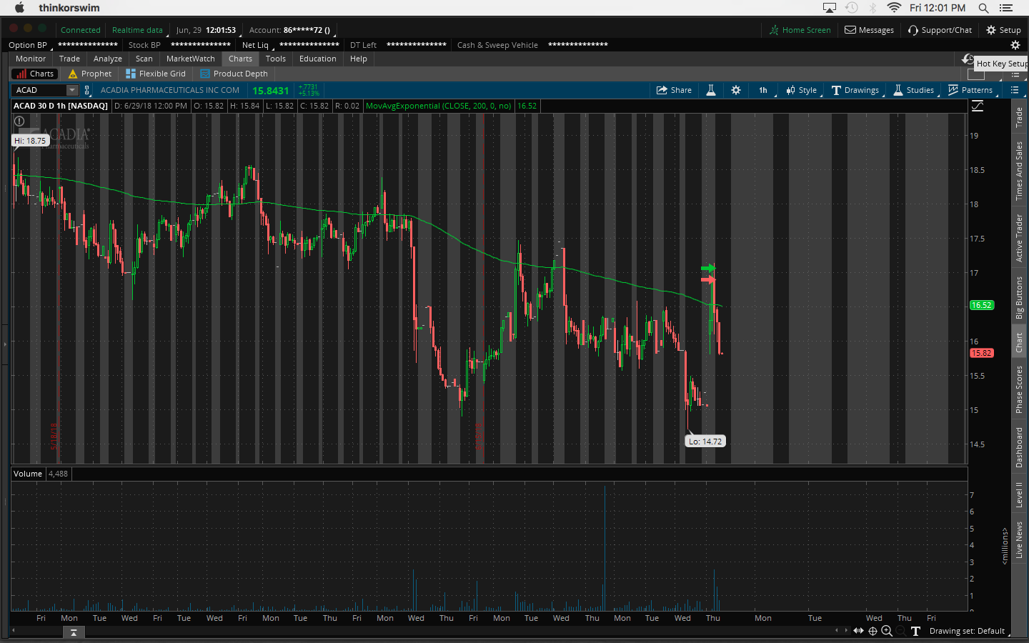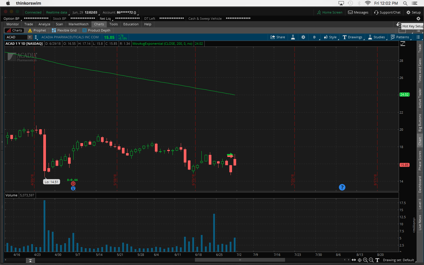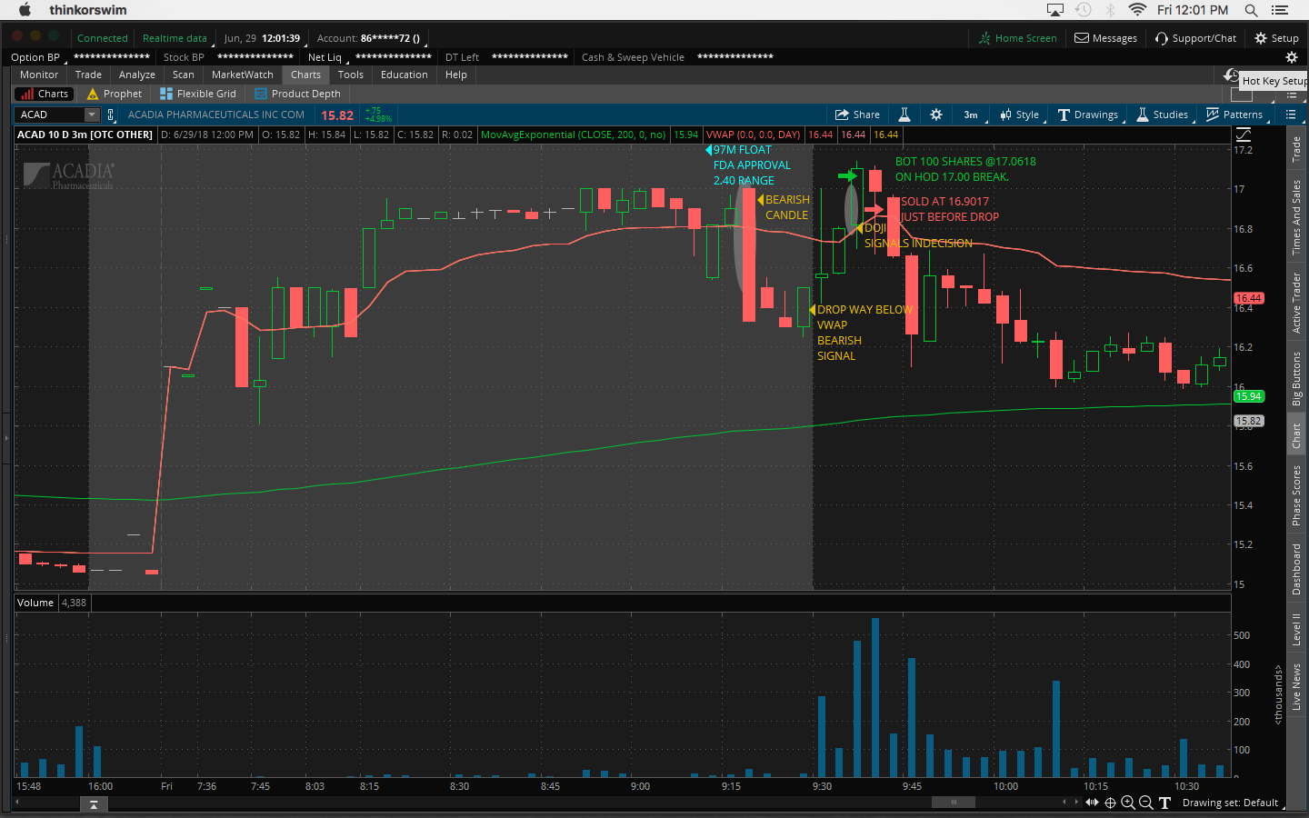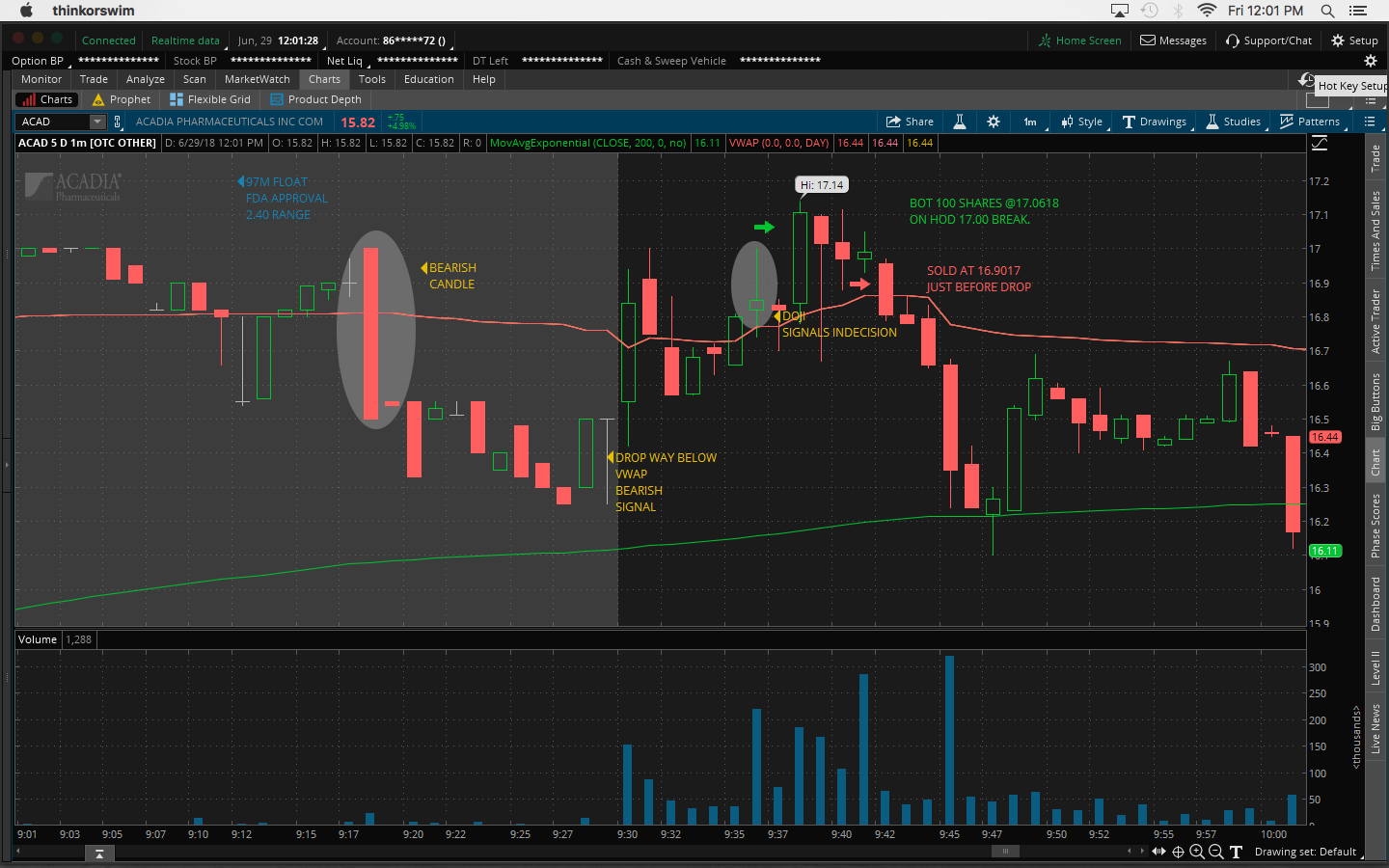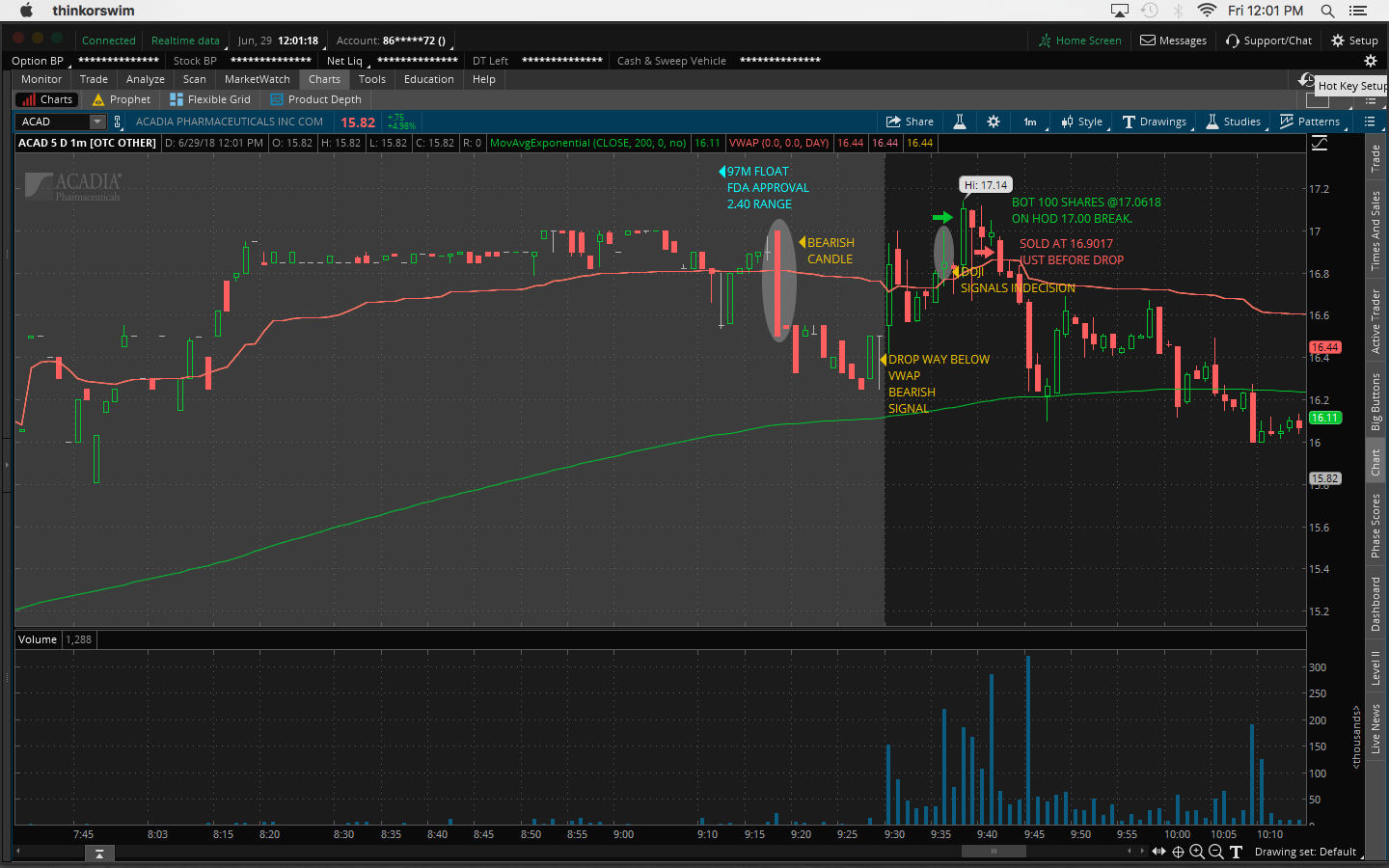 $ACAD trade, 97M, FDA approval, 2.40 range, 16c/share loss. Ignored all bearish signals pre & during market open, buying breakout not dips. Going to narrow focus and trade stocks below $15 not $20 so I don't get distracted looking at too many stocks and end up making stupid mistakes Posted Jun 29, 18 12:45 PMbyPandabearViews 208 / 0Related Trades-16.01 -- ACADby PandabearReceived 0 Karma1Ecord44 Jun 30, 18 12:19 AMYeah, these charts are just way too choppy. I would say focus on stock charts like CEI1Ecord44 Jun 30, 18 12:21 AMbuying breakouts expecting morning spike if volume is there. Pandabear Jul 03, 18 11:41 AM@Ecord44 Yep, that's what I'm going to do going forward and just trade stocks under $15 Join now or log in to leave a comment