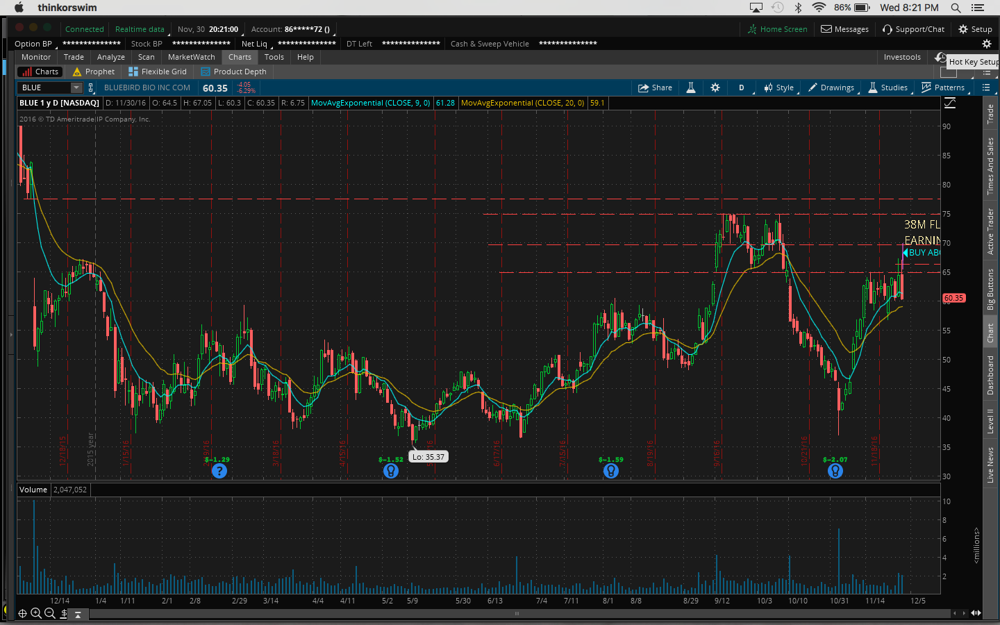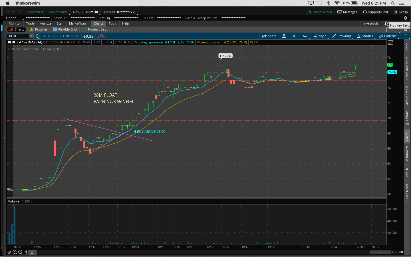 Saw this when it popped up on after-hours % gainers on NASDAQ but stopped watching it before it bull-flagged. The conference call is tomorrow at 8AM but would've been a nice evening play. I would've bought 58 shares at 68.50, stop below 68.00. It got up to 77.00 so would've been a nice $500 profit on a $4K investment. Need to keep watching for after-hours winners with clean charts like this one.
