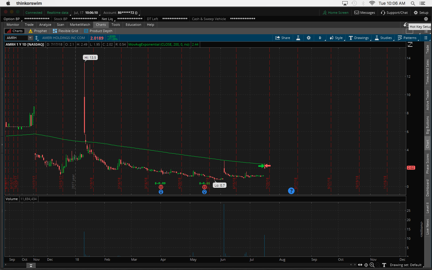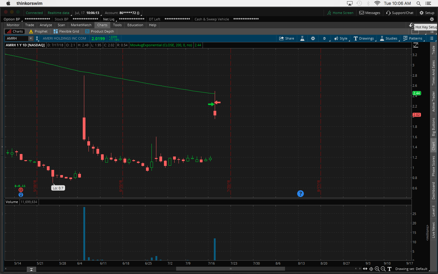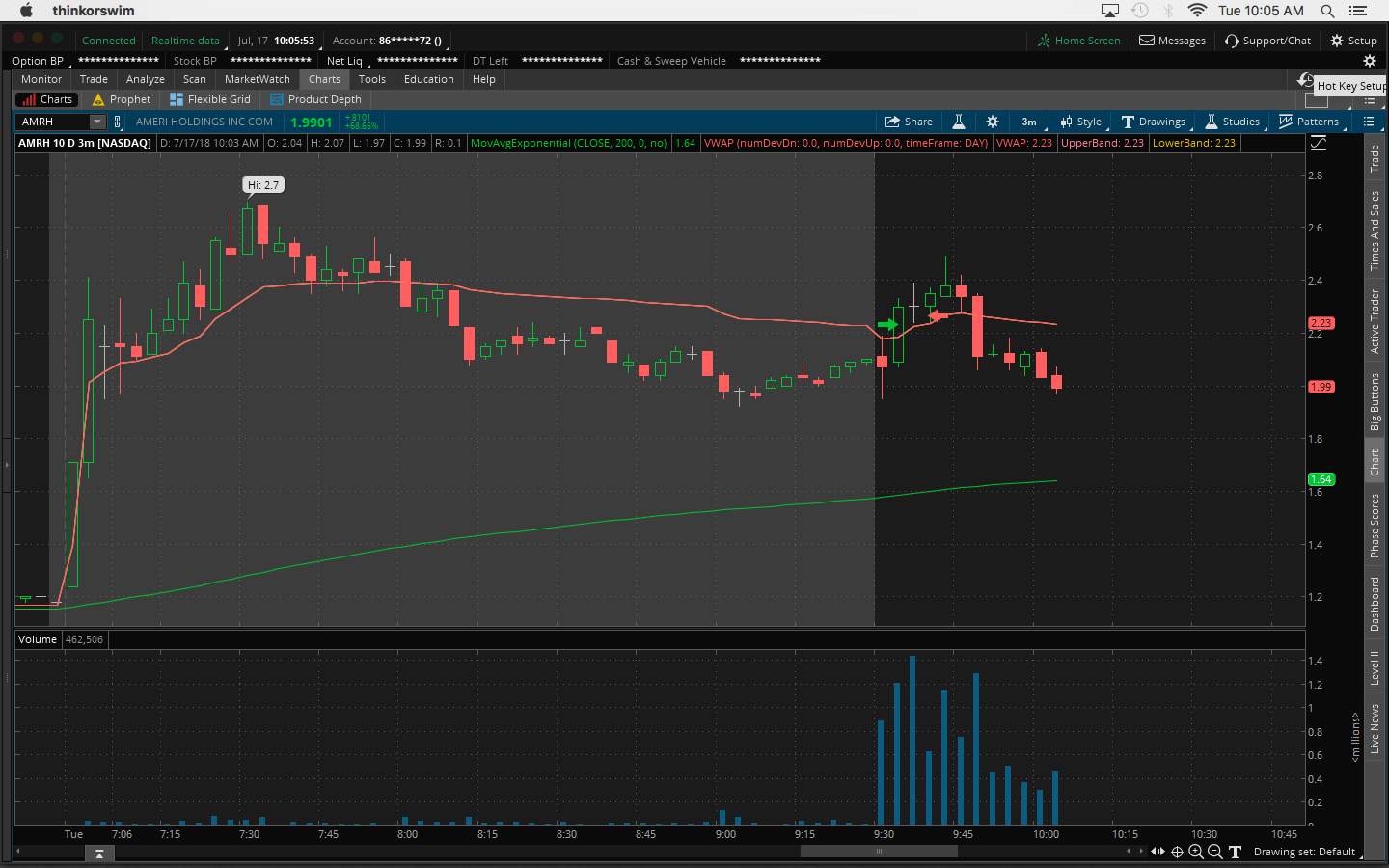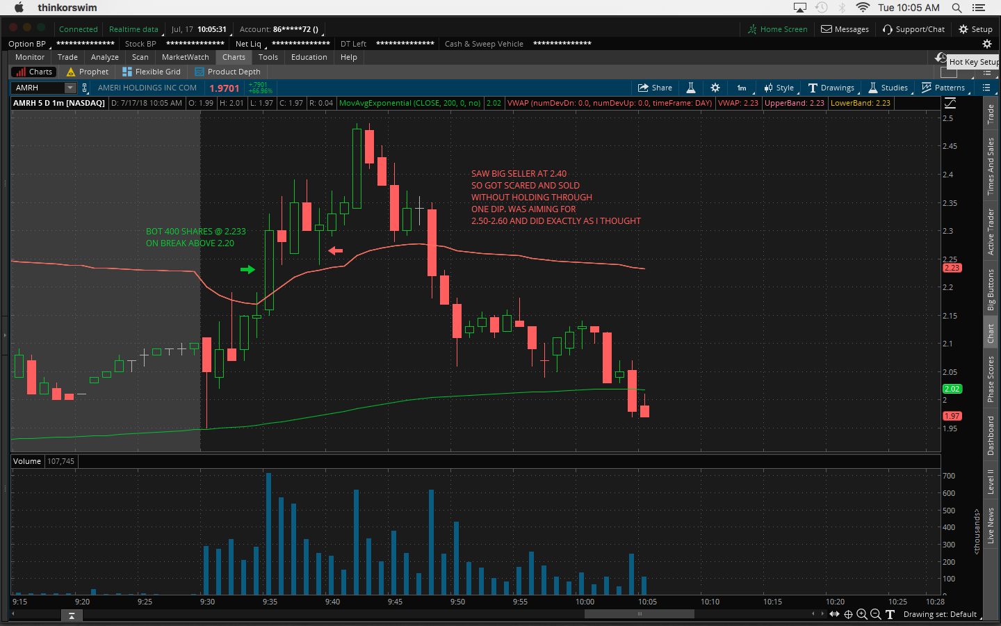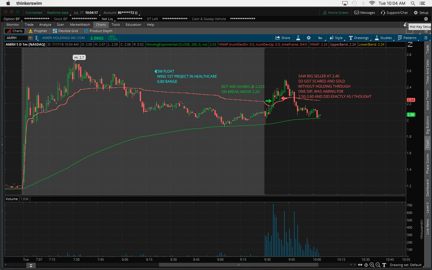 $AMRH trade, 5M float, wins 1st project in healthcare, 0.80 range. 3c/share win (scratch) could've been 25c/share but didn't follow exit process, got scared by big seller and sold on the dip instead of holding. Reached my goal of 2.50 so did exactly as I thought! Posted Jul 17, 18 10:12 AMbyPandabearViews 167 / 0Related Trades12.36 -- AMRHby PandabearReceived 0 Karmaavocado Jul 17, 18 1:04 PMGood Trade! How did you find these news in time though? I have good entries and exits but i always struggle at this type of stuff. Im assuming you must have found the news early or were you anticipating them?Pandabear Jul 18, 18 5:05 PM@avocado Hi, I found this on my pre-mkt scanner at 8am and the news was already there at 7:30am. Join now or log in to leave a comment
