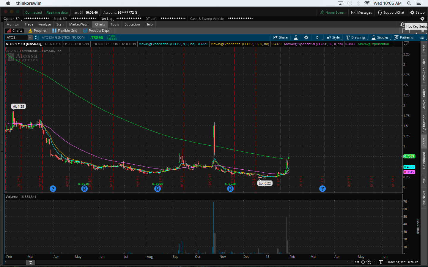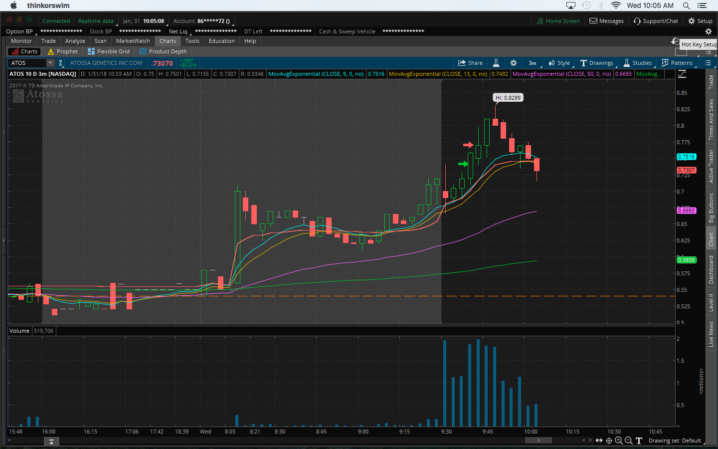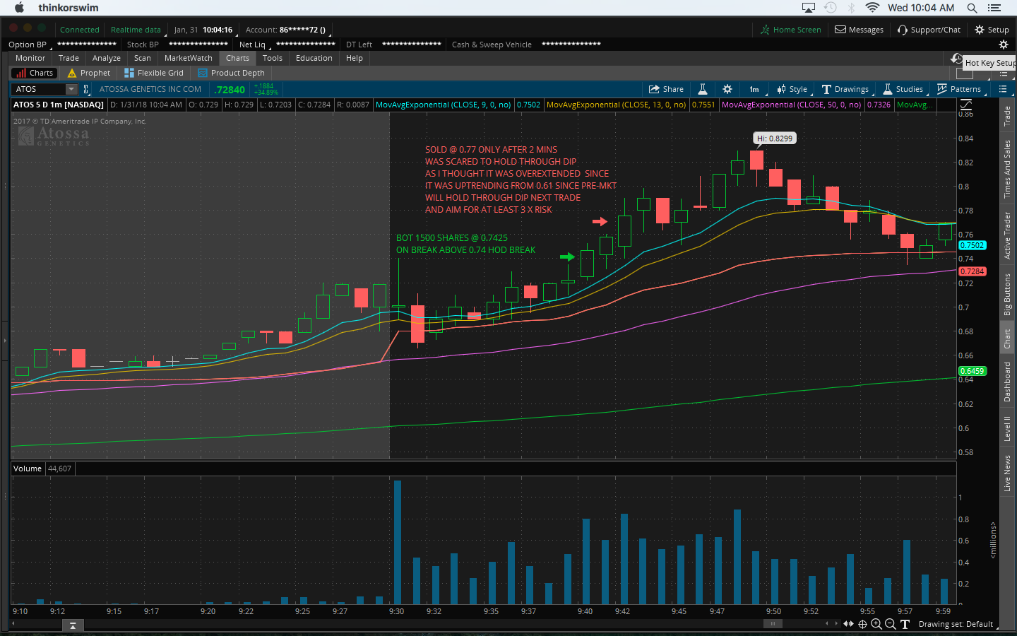 $ATOS trade, 22M float,no real news,hosting conf. call but day 4 of news. 2.75c/share win. Sold too soon. Thought it was overextended so didn't hold through dip. Need to aim for at least 3/4 x risk Posted Jan 31, 18 9:11 AMbyPandabearTickers ATOSViews 247 / 1Received 1 KarmaView previous commentsPandabear Jan 31, 18 7:19 PM@ChaseG Nice! You did better than me!GarseeTrader Jan 31, 18 7:58 PMNow after hours tho... can’t play the shoulda/woulda/coulda game tho GarseeTrader Jan 31, 18 7:58 PMHahahPandabear Feb 01, 18 5:22 AM@ChaseG Yeah I only play intraday and usually in the morning so it forces me to have zero regrets. 😊Join now or log in to leave a comment