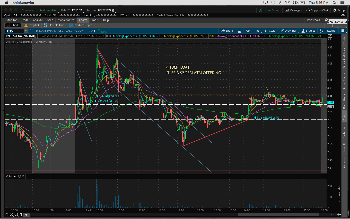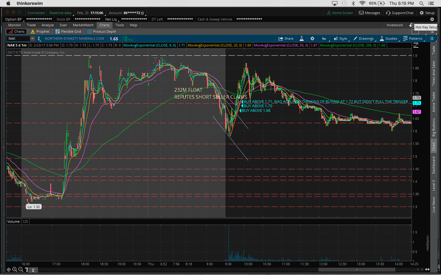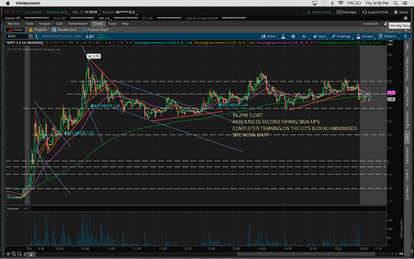 Charts for 2/23/17 - 11 stocks Posted Feb 23, 17 5:33 PMbyPandabearTickers OWCP, KEM, PTX, EYEG, UCTT, NAK, CETX, HOS, GNC, SQ, NVFYViews 82 / 0Received 0 Karmaavinash2060 Feb 23, 17 6:26 PMany tips for RNVA?Pandabear Feb 23, 17 7:36 PM@avinash2060 I don't like that it closed down on the day and there's resistance at 2.50 but I think you know better than me. You're up $24K :) Join now or log in to leave a comment