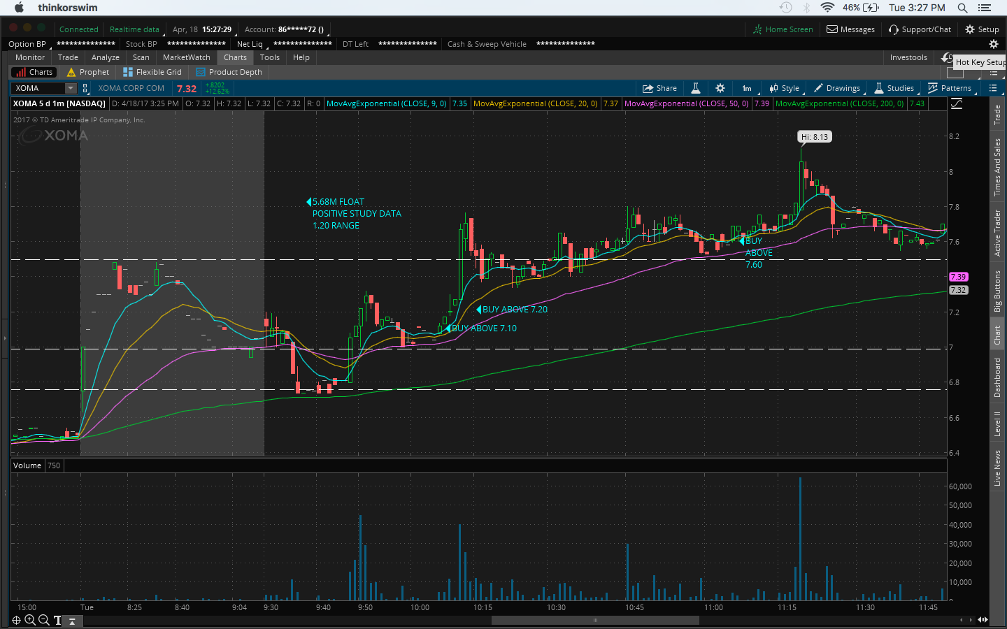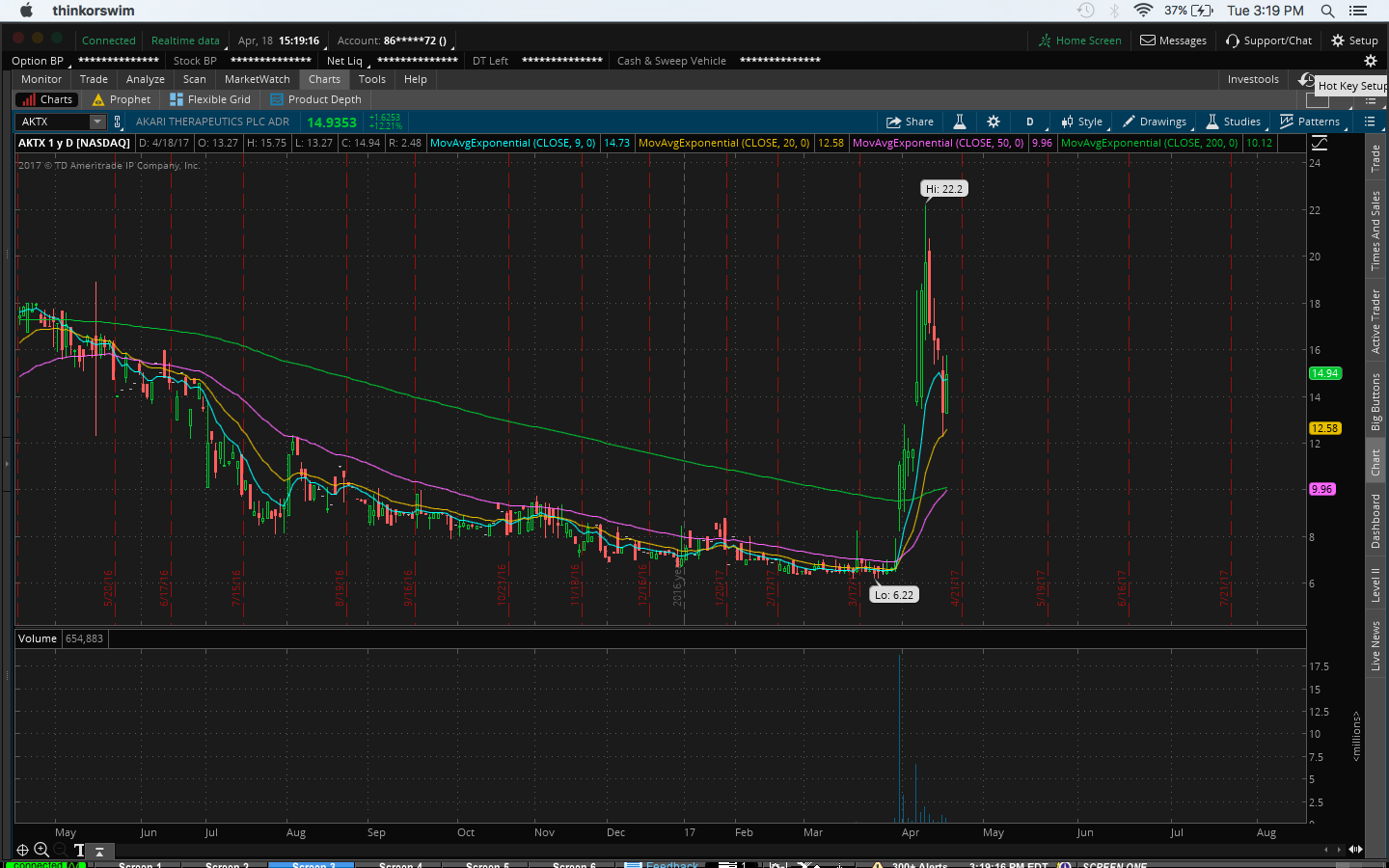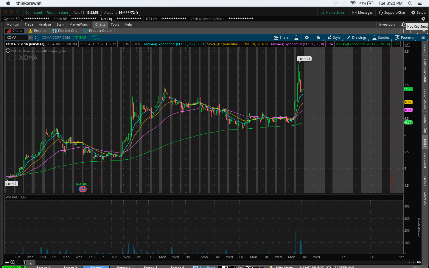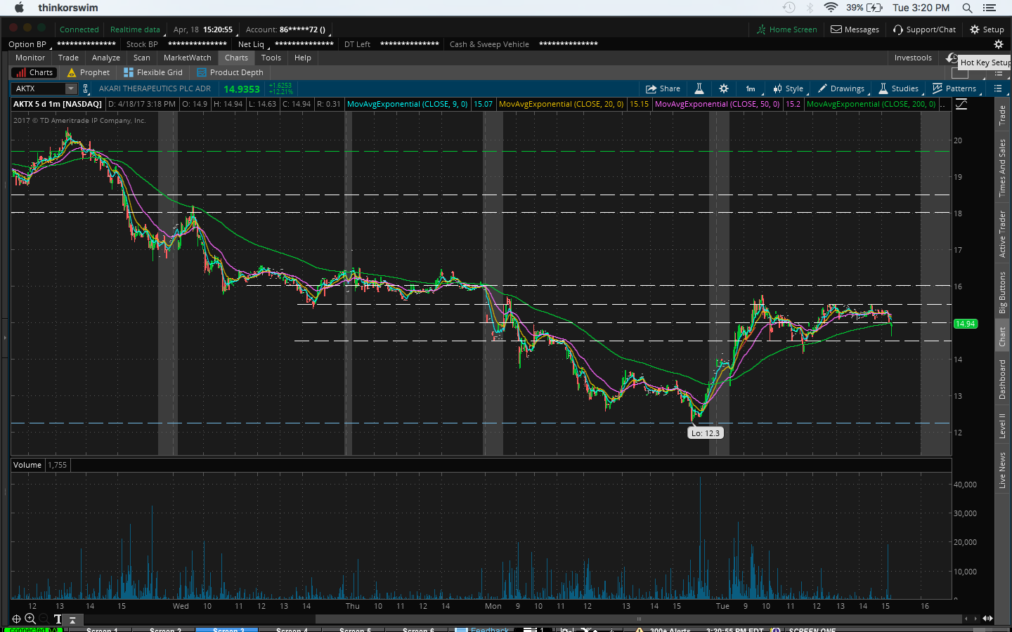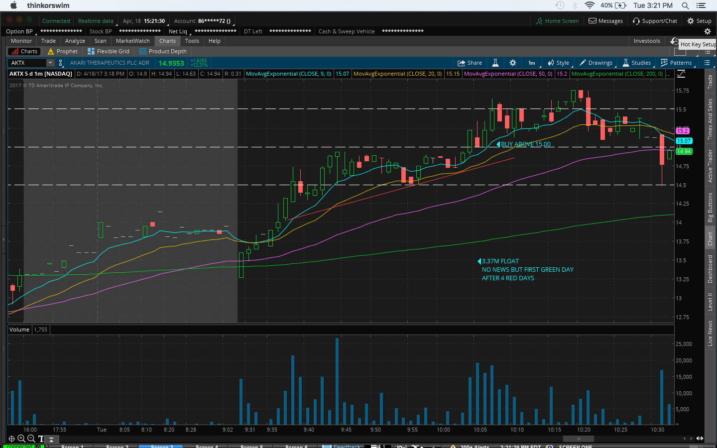 Charts for 4/18/17 - 6 stocks Posted Apr 18, 17 3:40 PMbyPandabearTickers AKTX, XOMA, CBLI, IDXG, SCON, GNCViews 178 / 1Received 1 Karma1DreamMaker Apr 18, 17 4:17 PMYou know the charts, be confident in your ability to make the trades. I hope to see your profits climb. I wish you the best. Pandabear Apr 18, 17 6:48 PM@DreamMaker Thanks. I hesitated on IDXG this morning as I had a negative bias after losing on it before. Join now or log in to leave a comment