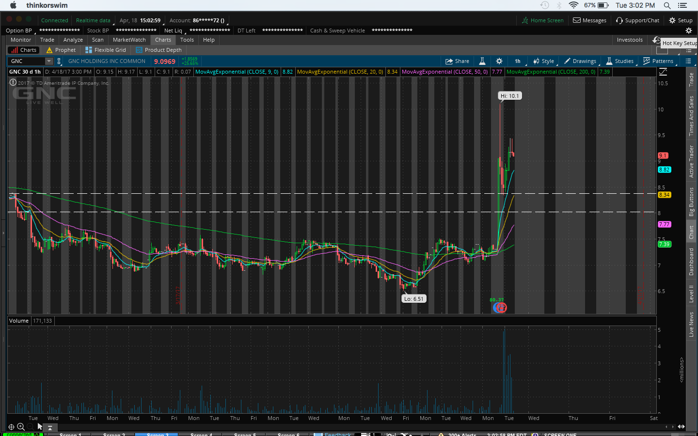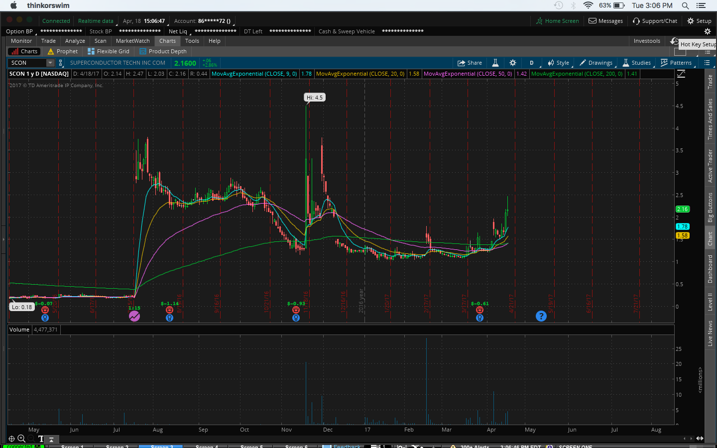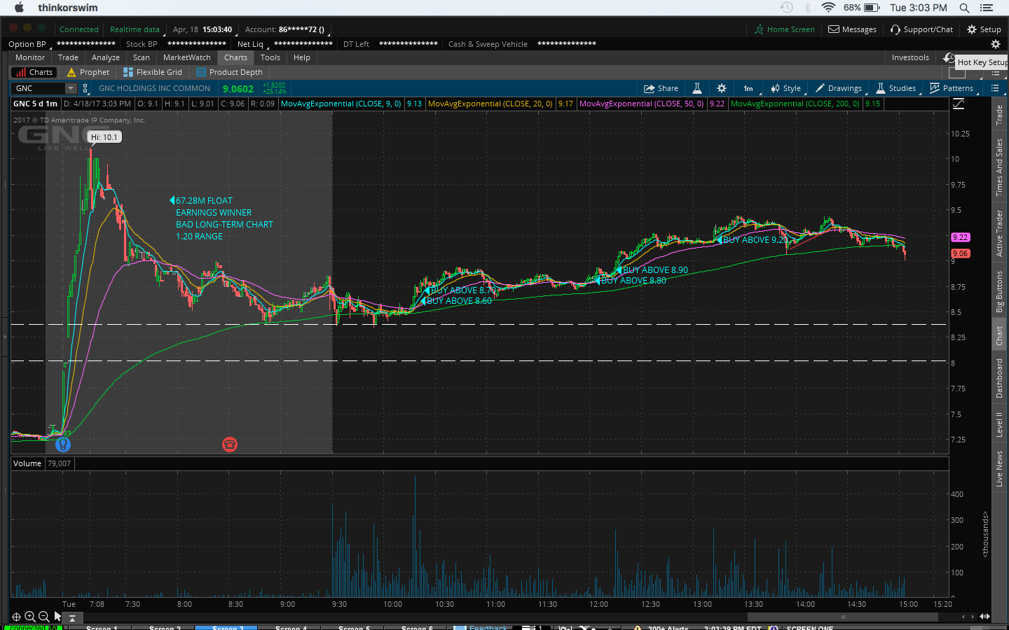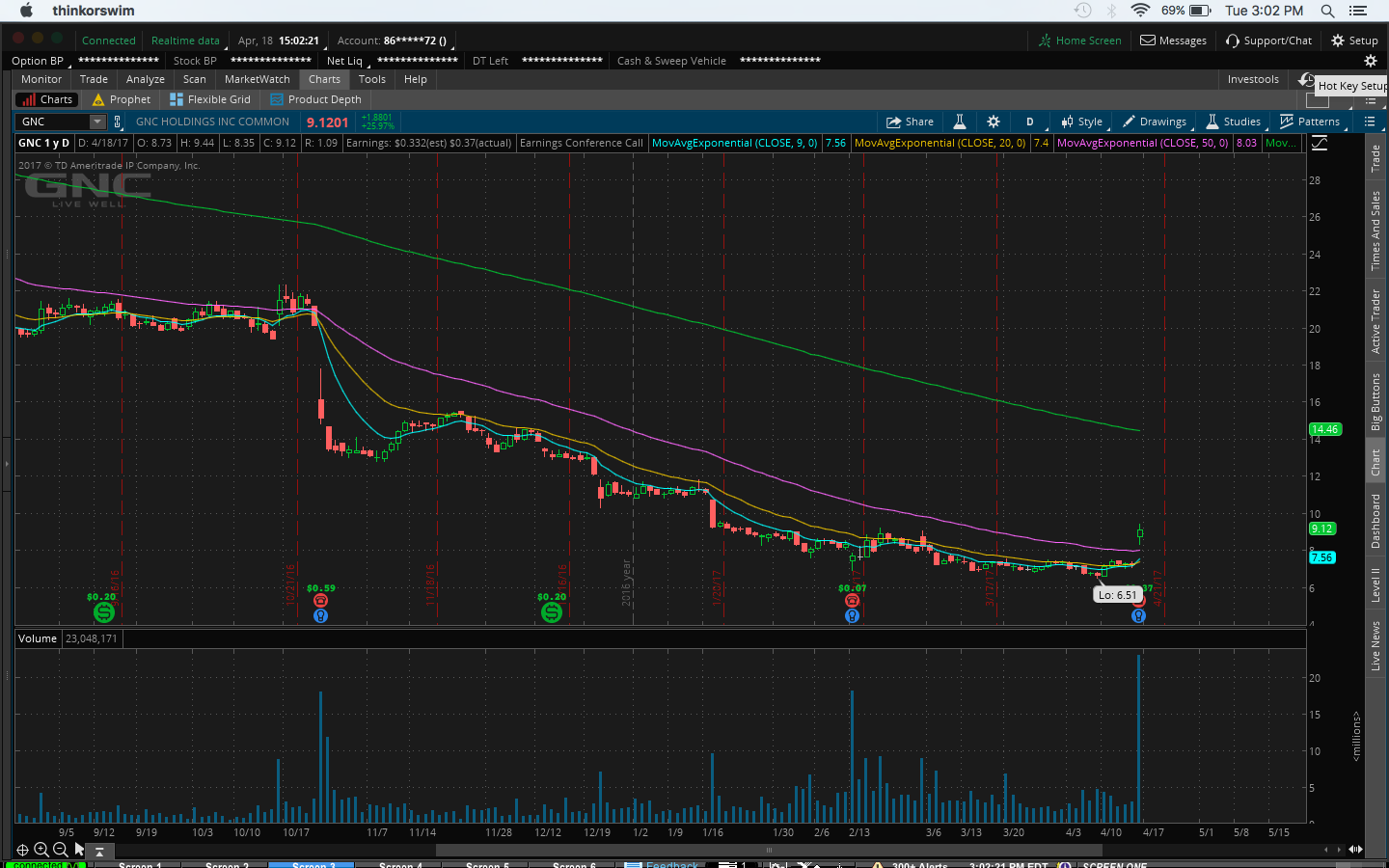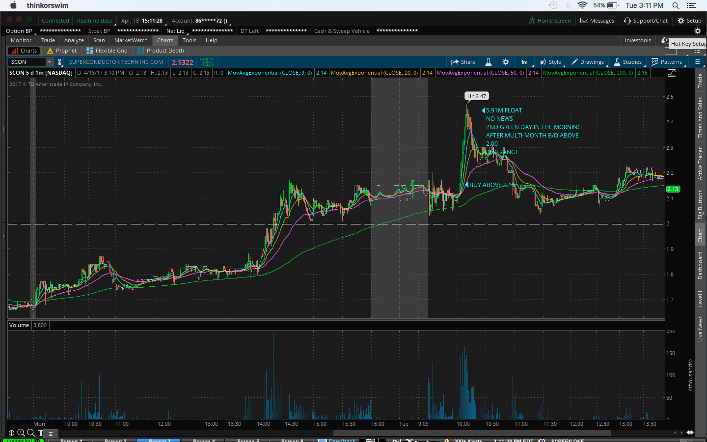 Charts for 4/18/17 - 6 stocks Posted Apr 18, 17 3:40 PMbyPandabearTickers AKTX, XOMA, CBLI, IDXG, SCON, GNCViews 178 / 1Received 1 Karma1DreamMaker Apr 18, 17 4:17 PMYou know the charts, be confident in your ability to make the trades. I hope to see your profits climb. I wish you the best. Pandabear Apr 18, 17 6:48 PM@DreamMaker Thanks. I hesitated on IDXG this morning as I had a negative bias after losing on it before. Join now or log in to leave a comment