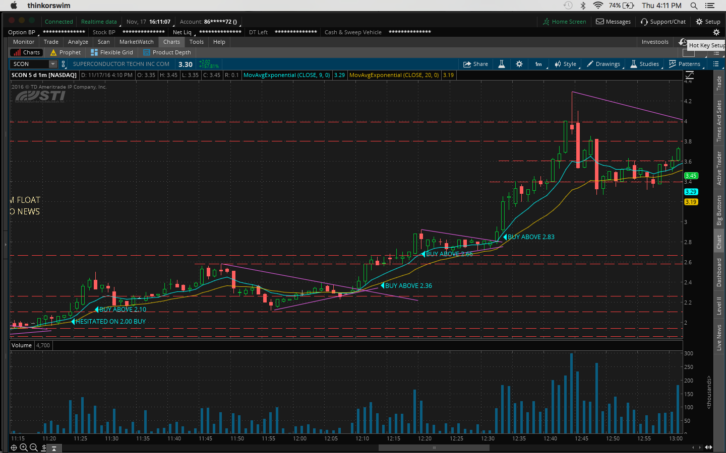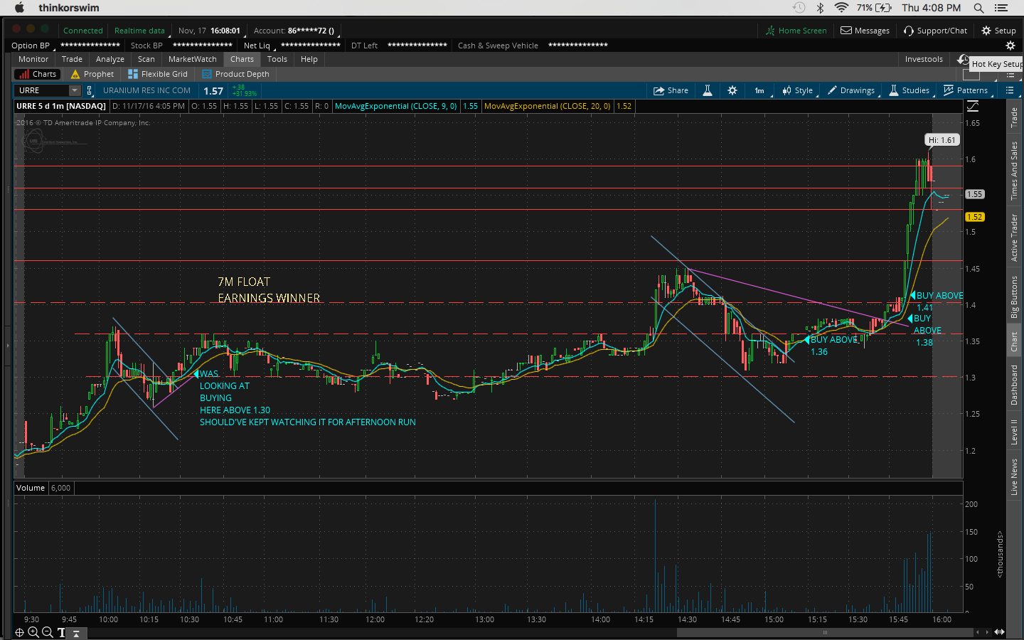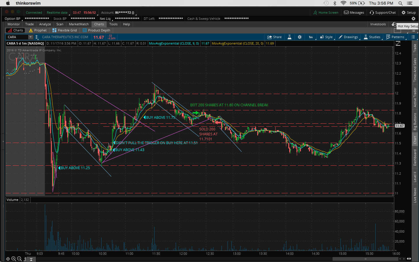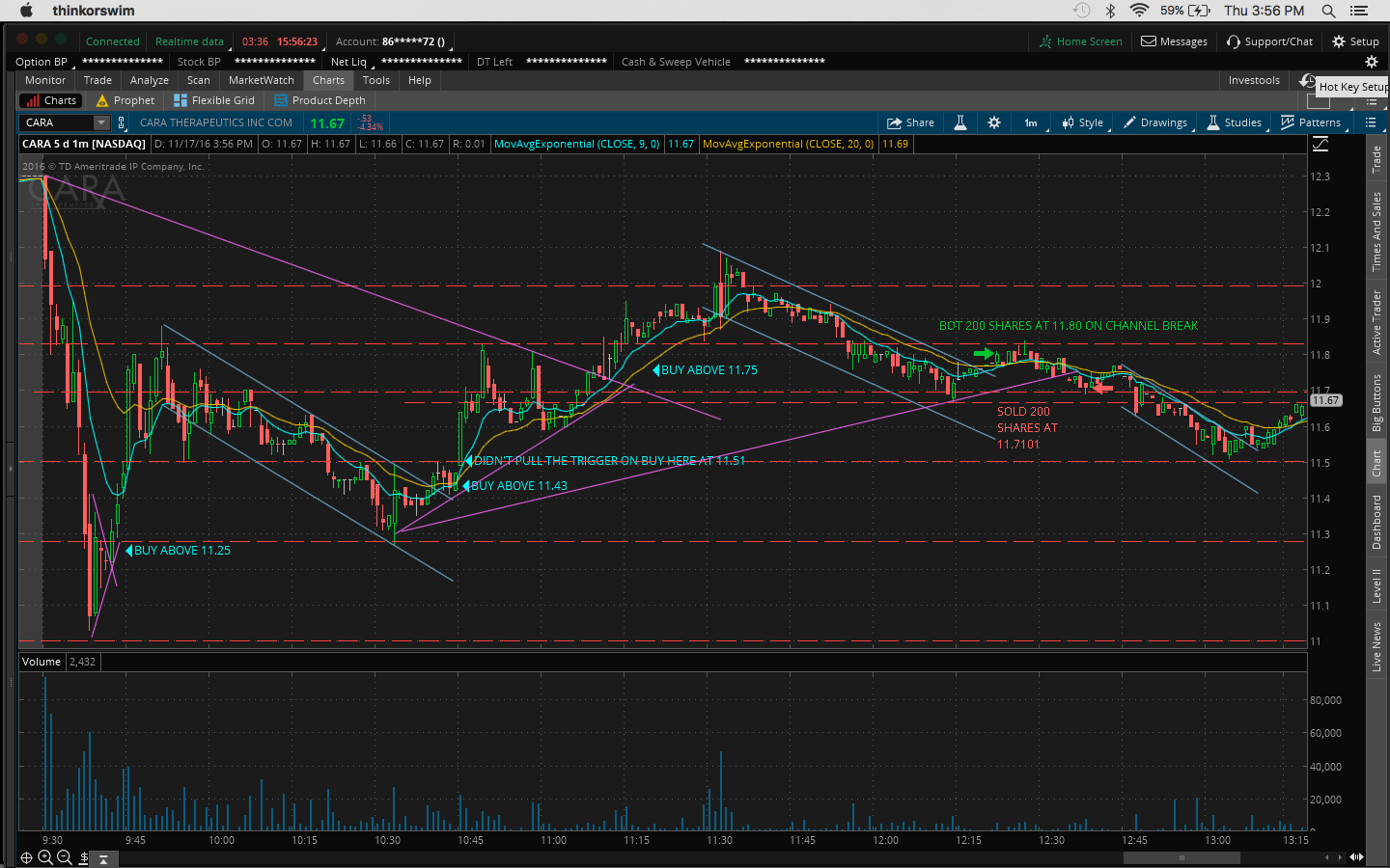 4. There was a bit of fomo going into the trade because I hesitated on a morning buy at 10:45AM at 11.51 when it broke the channel at 11.43 and resistance at 11.50 which would've been a nice 60c/share profit.