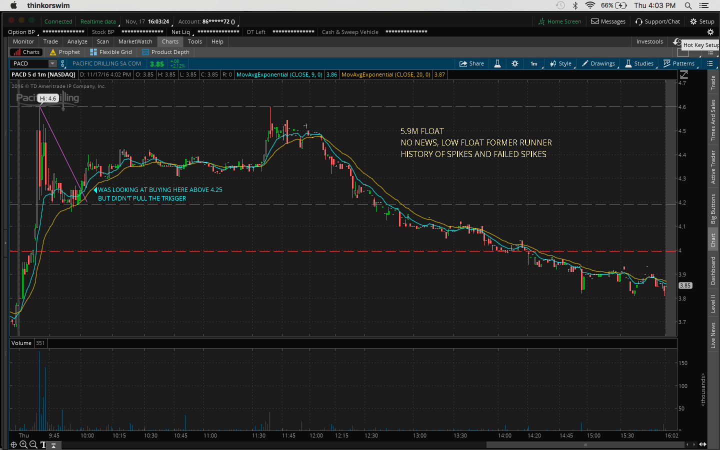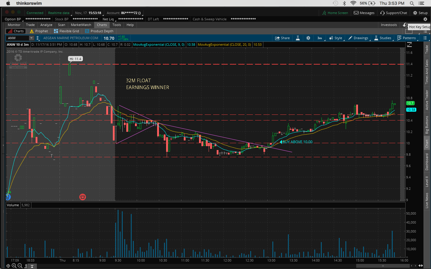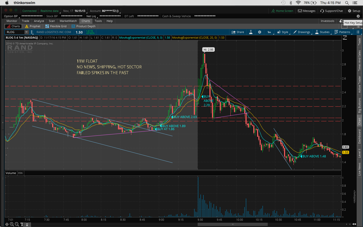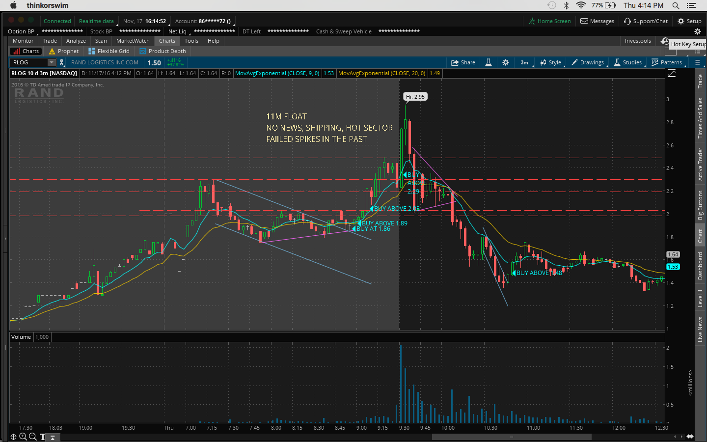 4. There was a bit of fomo going into the trade because I hesitated on a morning buy at 10:45AM at 11.51 when it broke the channel at 11.43 and resistance at 11.50 which would've been a nice 60c/share profit.