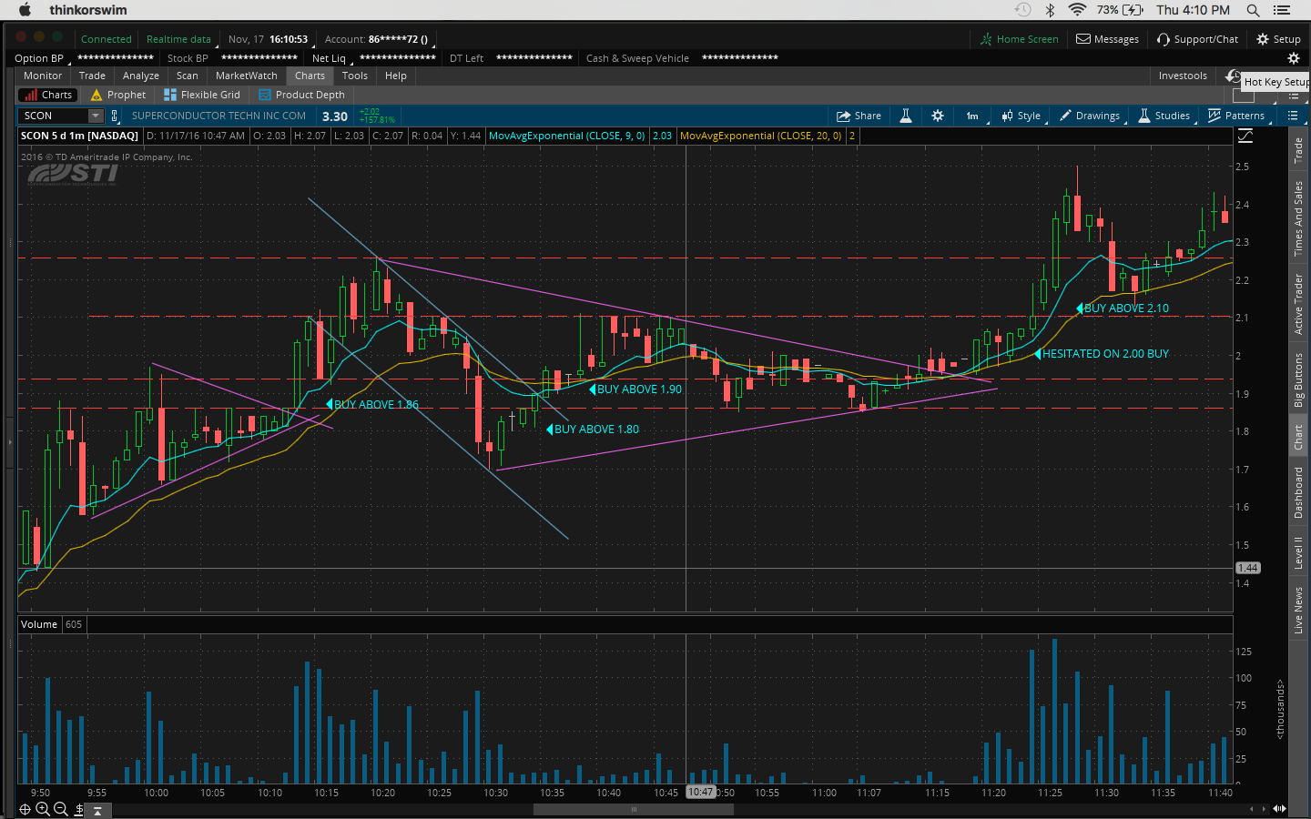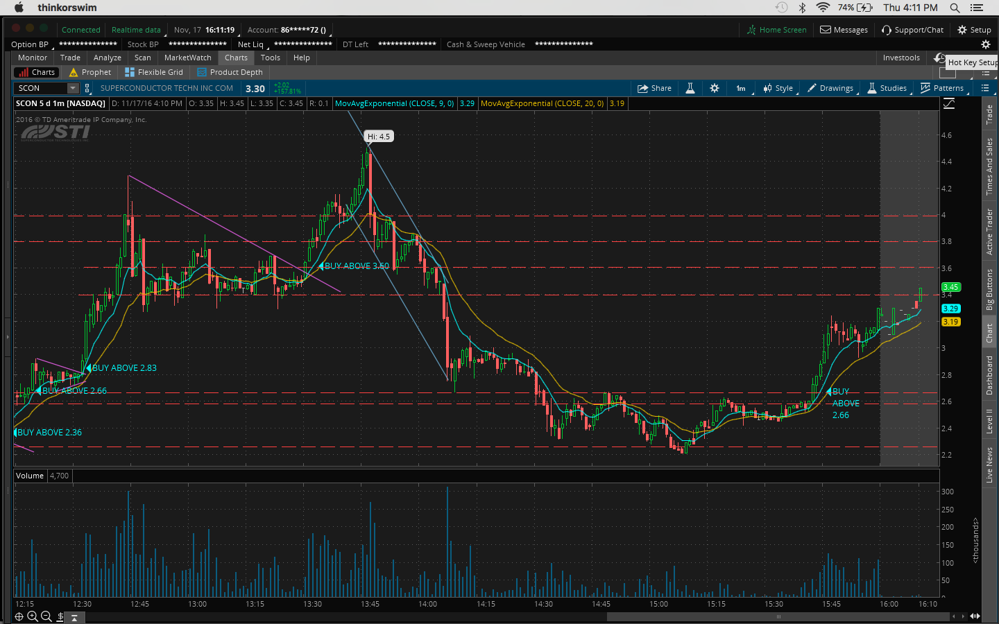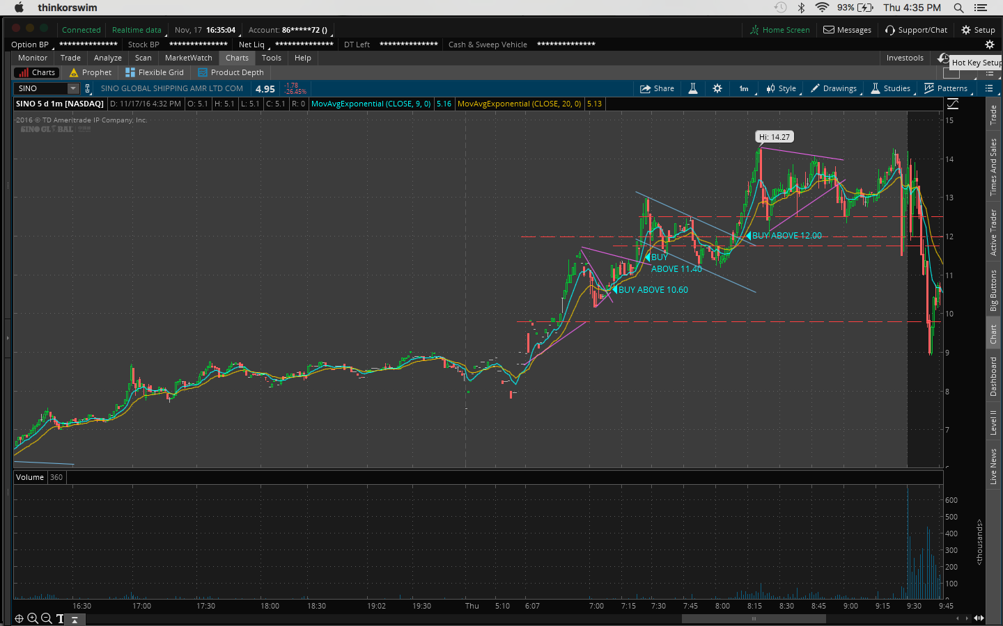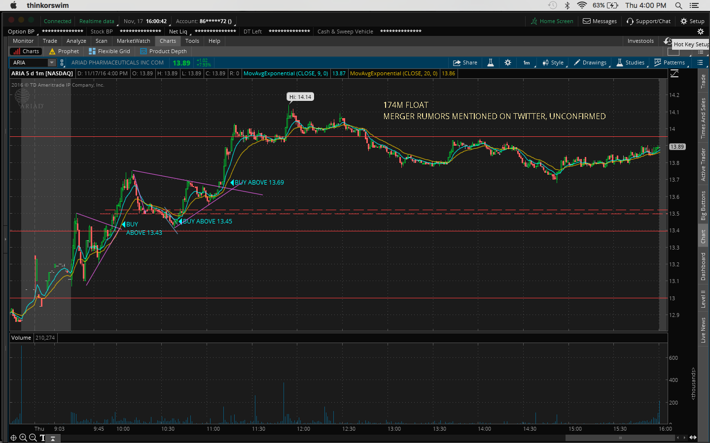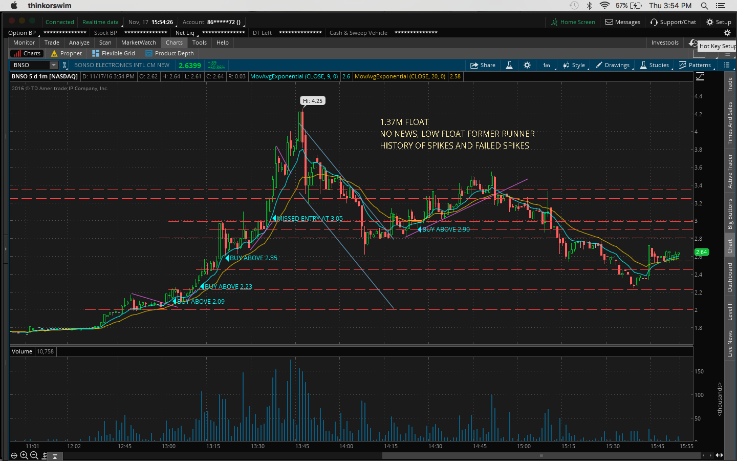 4. There was a bit of fomo going into the trade because I hesitated on a morning buy at 10:45AM at 11.51 when it broke the channel at 11.43 and resistance at 11.50 which would've been a nice 60c/share profit.