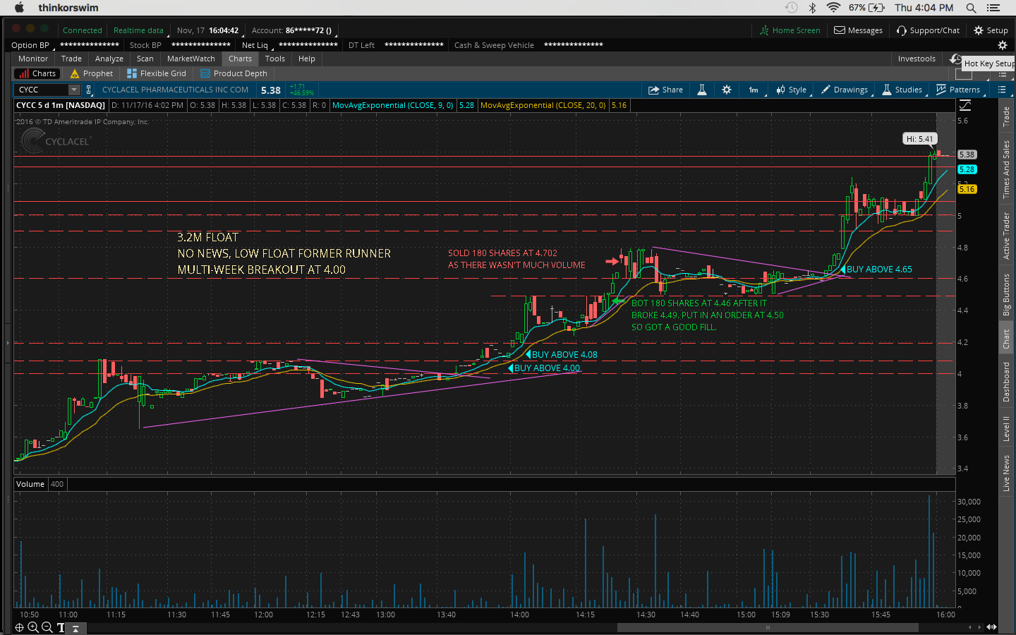 The second stock I played was $CYCC. I was really happy with this trade because I didn't let the previous loss affect me and played the price action. I saw this stock on yahoo % gainers. There wasn't any news but it's a low-float former runner with a multi-week breakout at 4.00. So when it broke 4.49 resistance, I placed an order to buy 180 shares at 4.50 and got a really good fill at 4.46. I sold a few minutes later at 4.70 as the volume was low and I just wanted to be green after the last loss. I should've kept watching this as there was another chance to buy at 3:35PM when it broke the flag at 4.65. It ran all the way to 5.40 and got up to 5.48 after hours. I wouldn't have held overnight but if I just waited till the close to sell it would've been a nice 20% win as it held the breakout level at 4.49/4.50 and never hit my stop of 4.35.