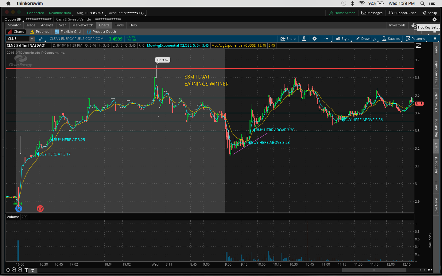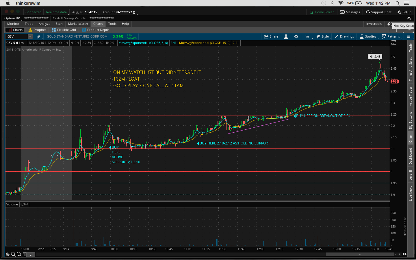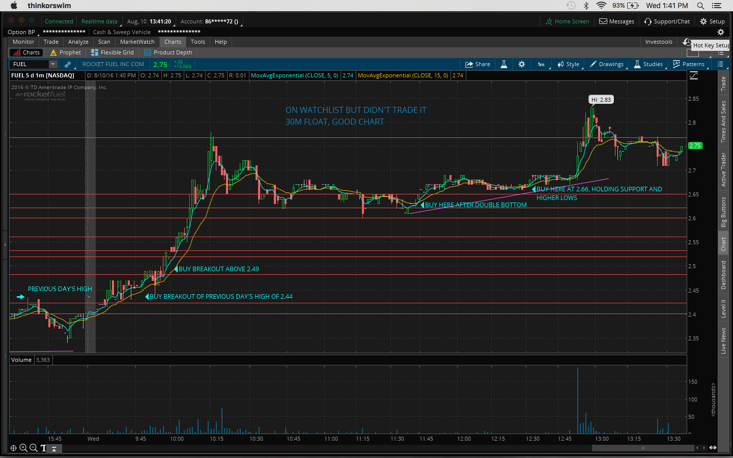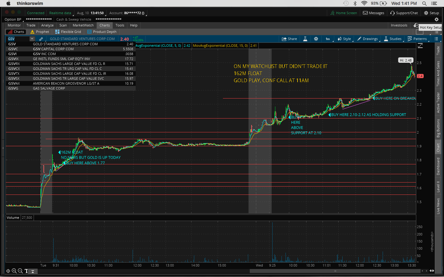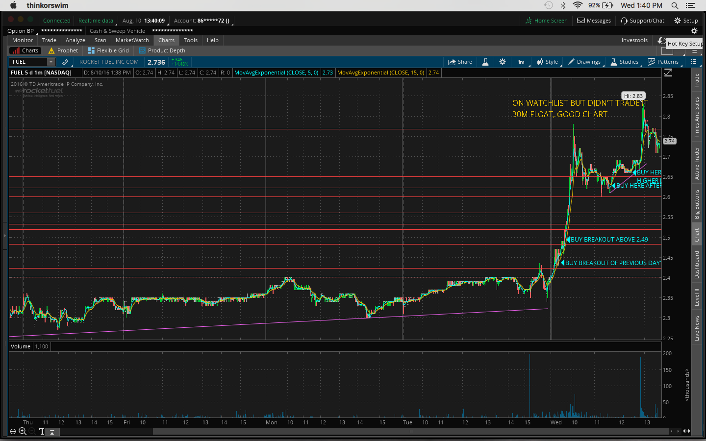 Today I made the mistake of not watching my watchlist closely. I got distracted by other plays that I shouldn't have been looking at since I missed out on the after-hours move yesterday, eg. $OCN, $CLNE. I was actually watching $TOPS and $REN at the open but gave up when I thought it was going to go down. So right then I should've gone back to my watchlist as $FUEL and $GSV were moving. $FUEL had the best chart. It was a great buy above the previous day's high of 2.44. It got up as high as 2.83 today. $GSV is up 32% and it's still going as I type this. Yesterday's close was 1.93 and it's now 2.57.