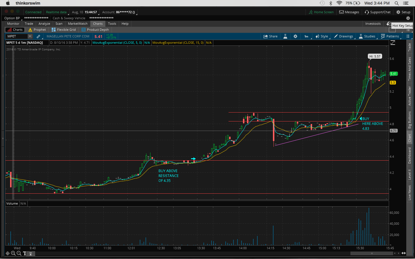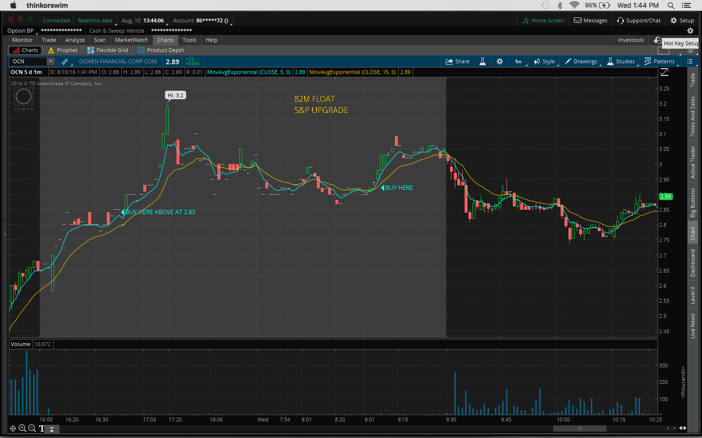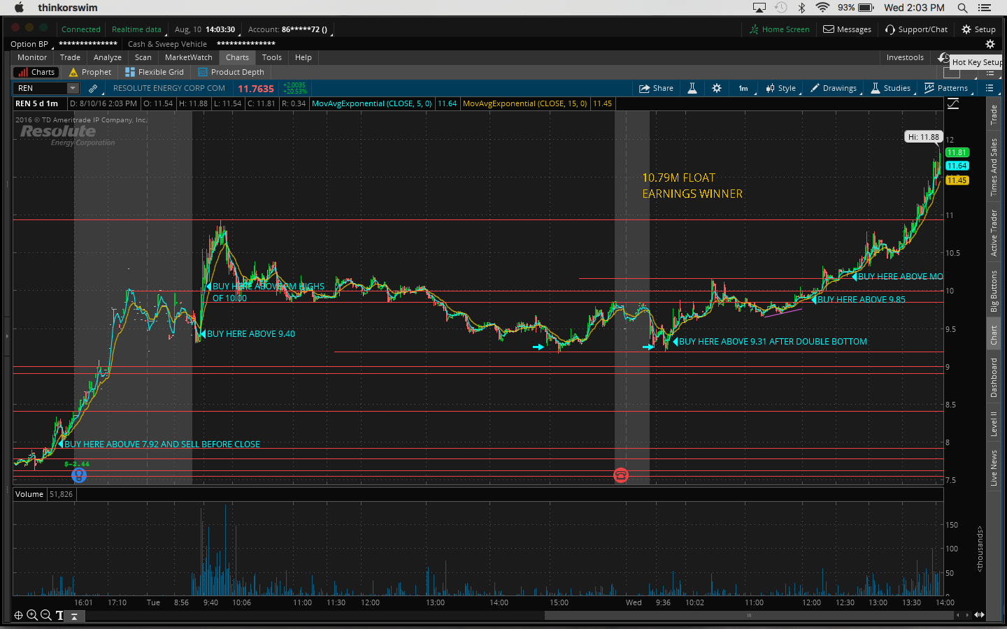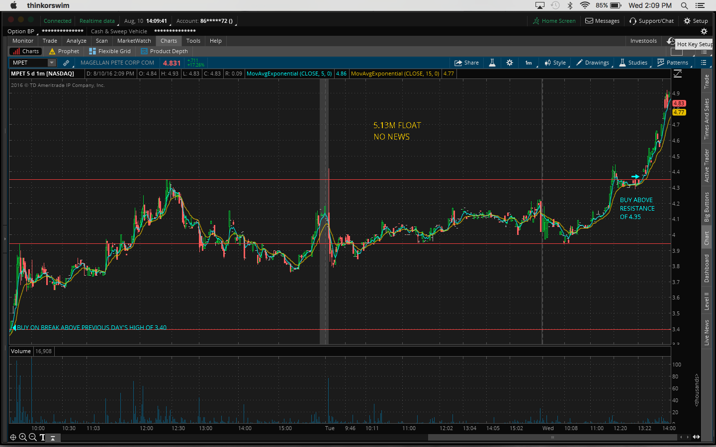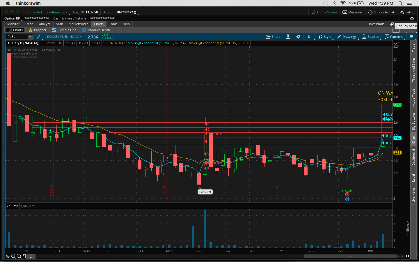 Today I made the mistake of not watching my watchlist closely. I got distracted by other plays that I shouldn't have been looking at since I missed out on the after-hours move yesterday, eg. $OCN, $CLNE. I was actually watching $TOPS and $REN at the open but gave up when I thought it was going to go down. So right then I should've gone back to my watchlist as $FUEL and $GSV were moving. $FUEL had the best chart. It was a great buy above the previous day's high of 2.44. It got up as high as 2.83 today. $GSV is up 32% and it's still going as I type this. Yesterday's close was 1.93 and it's now 2.57.