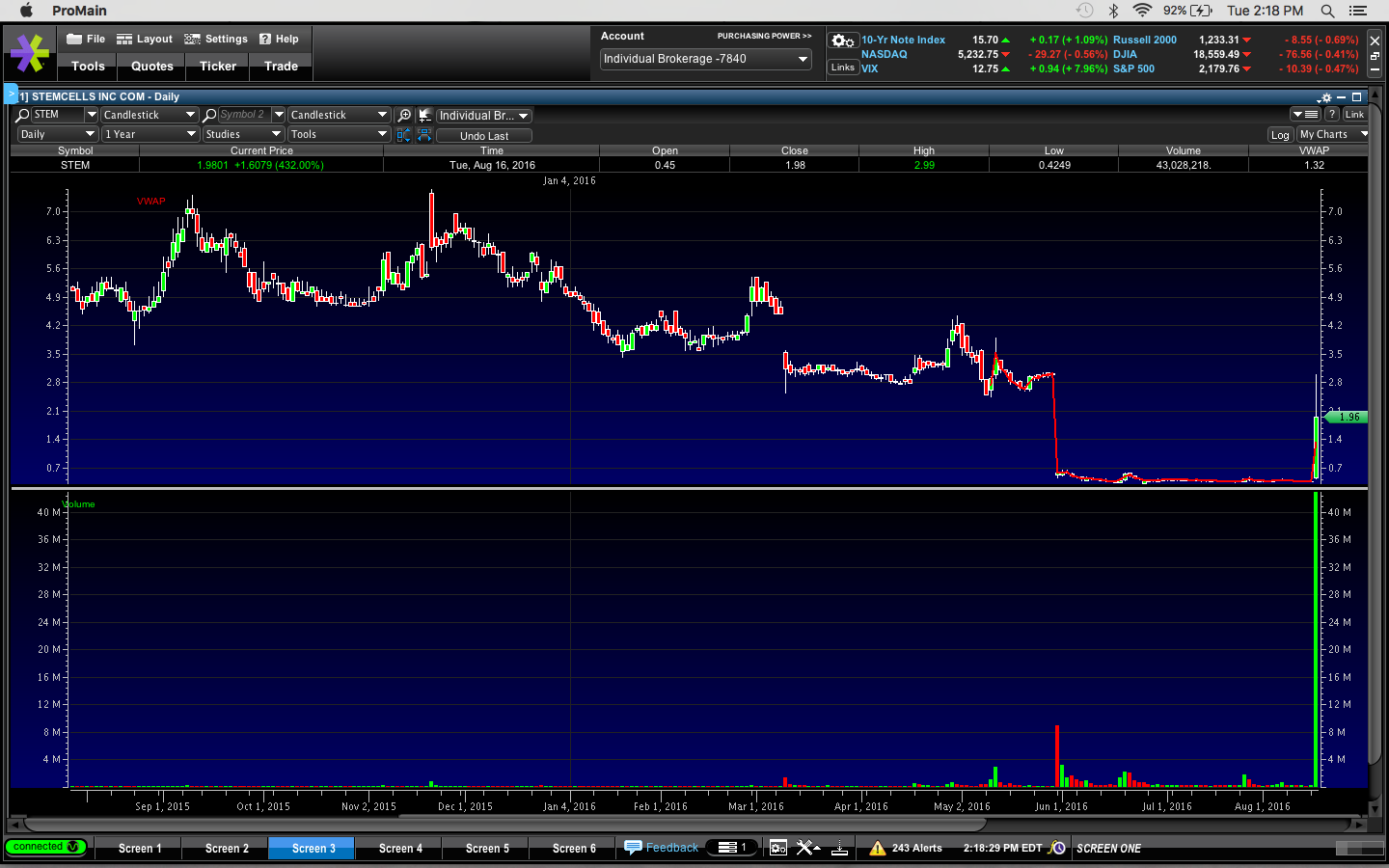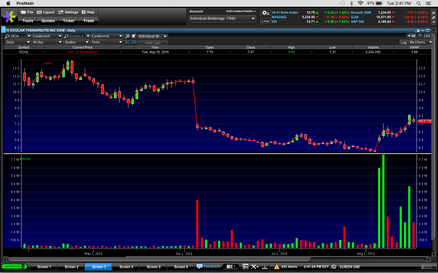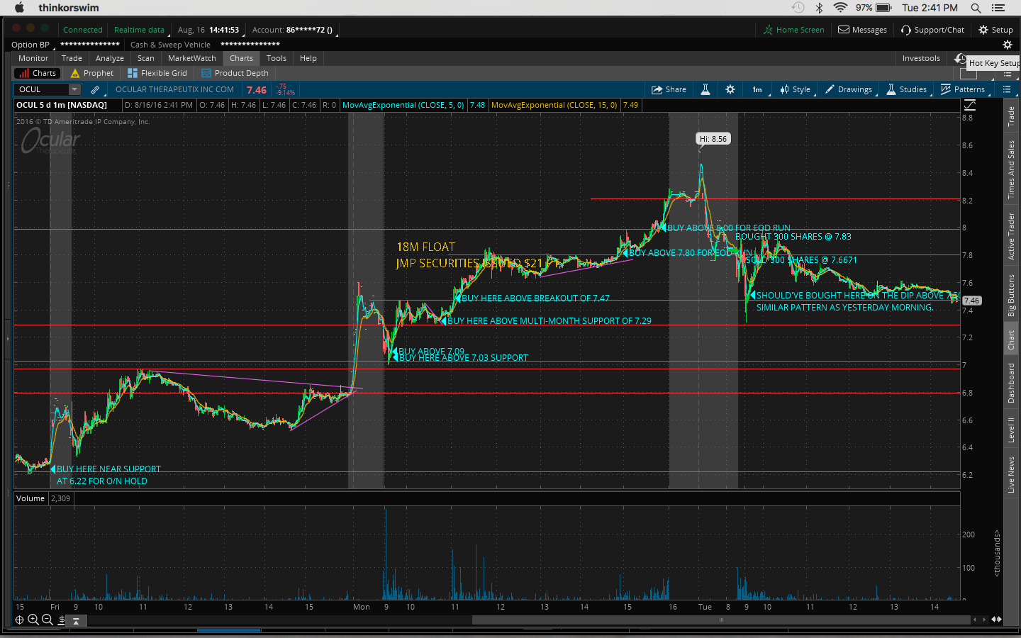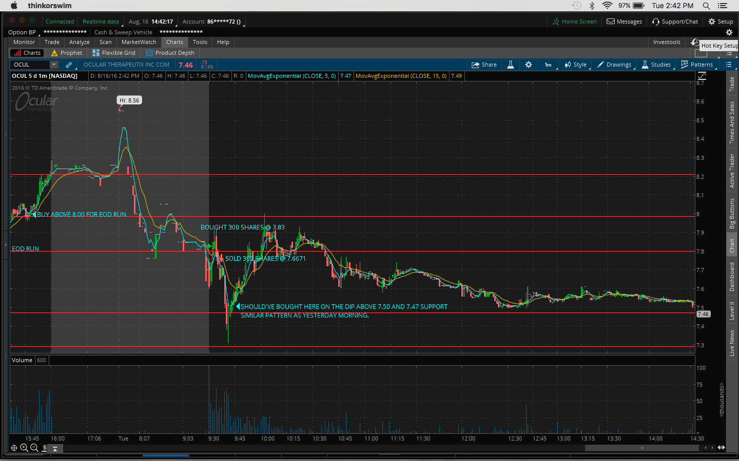 I bought $OCUL this morning and lost $64 after commissions. Instead of buying on the dip I bought too early right at the open when it broke out. See detailed analysis in my previous post this morning. Today there weren't that many movers and after my loss this morning I stopped myself from trading as I was a little annoyed with myself.