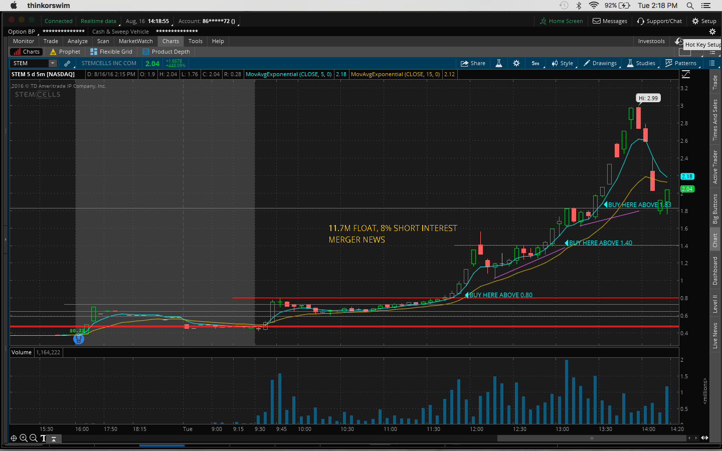 The hot stock of the day was $STEM. Tim warned everyone that this is not his chart pattern since it has a bad chart like $AUPH which gapped down yesterday but I included it in this post as it had a clean chart pattern up until 1.30PM today.