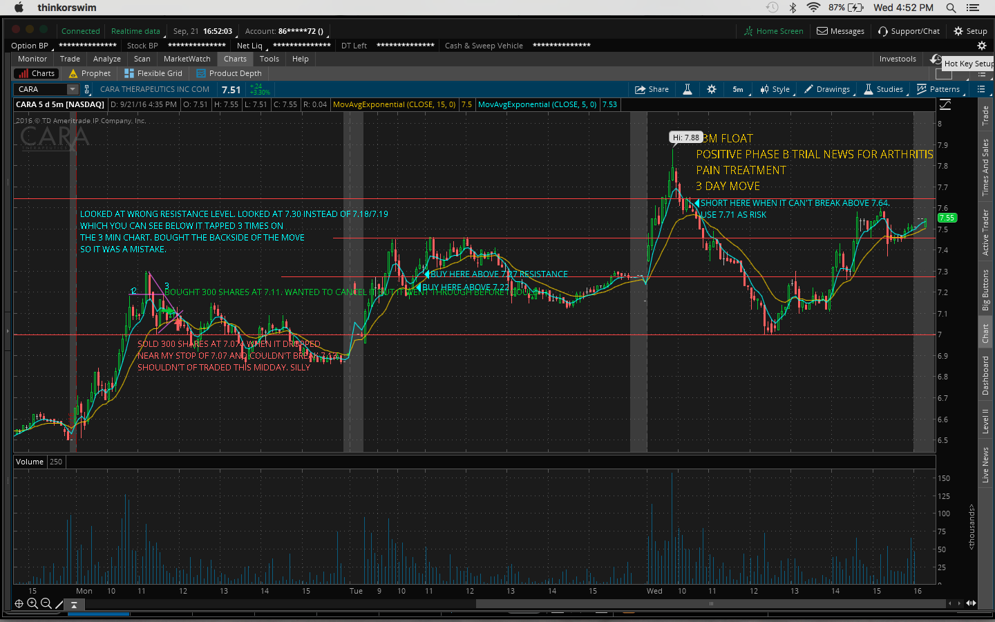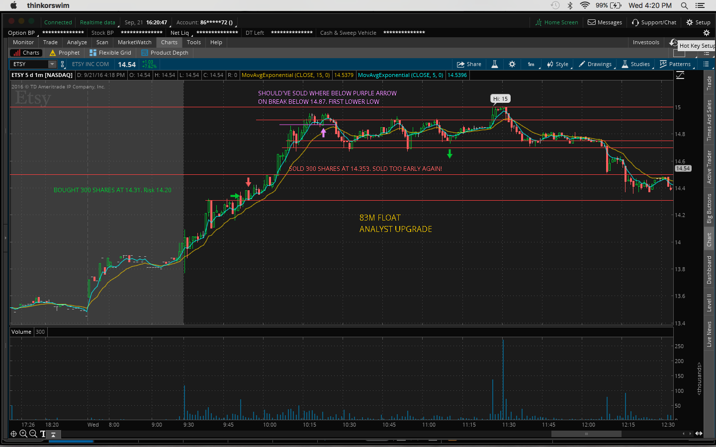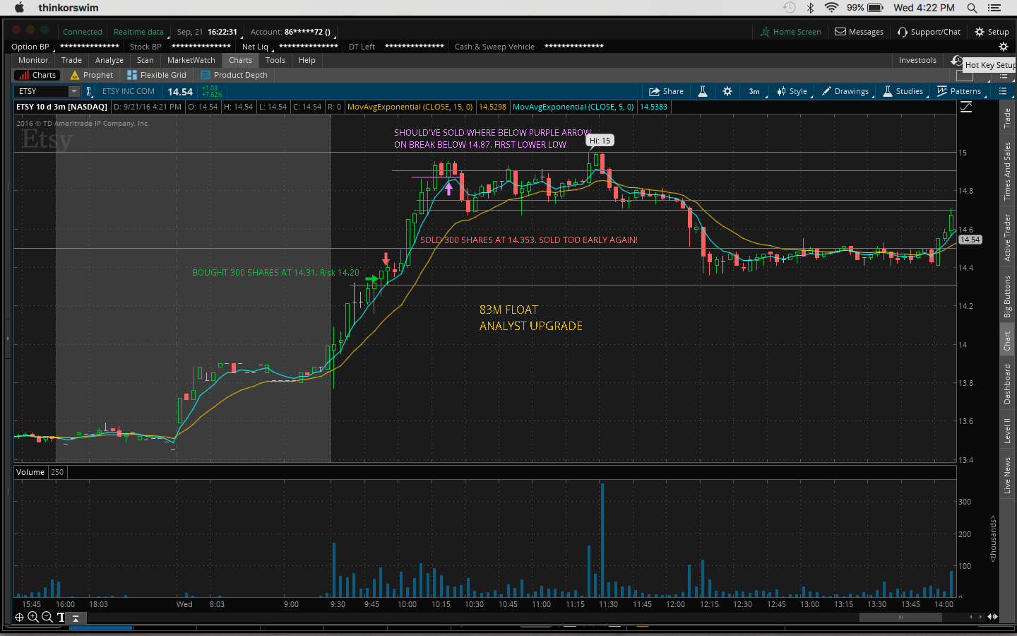 Today I bought $ETSY which was up on an analyst upgrade. I bought 300 shares at 14.31 when it broke the ascending triangle at 14.30. I sold a few minutes later at 14.353 when it looked like it couldn't break 14.38. It then went all the way to 15.00. My price target was about 14.50 so I should have at least waited till it reached that. I even said to myself that if it broke 14.50 it could go to 15.00 which is exactly what it did. So I could've made $200 instead of making $12.90 which after commissions was a loss of $3. I need to have more patience and let the trade pan out. What I should've done was use the initial break of 14.30 as support once I was in the trade. It did drop to 14.25 after which was still above my risk of 14.20. But then when it went past 14.30 again that should've been the new support/risk level so if it broke that and went down to 14.29 then I would sell. Adjusting the risk like this allows winners to run. You can see on the chart that it just kept going up from there and never went below 14.30. Then after that I should've used the 3 min chart to see where to exit. If I did I would've seen all the higher lows up until the 2nd red candle at 14.95. Then my sell would be below the break of that candle at 14.87 when it makes the first lower low (purple arrow). Watching the 5 ema (blue line) would've helped as well as you can see all the candles were above it which means it's still uptrending.