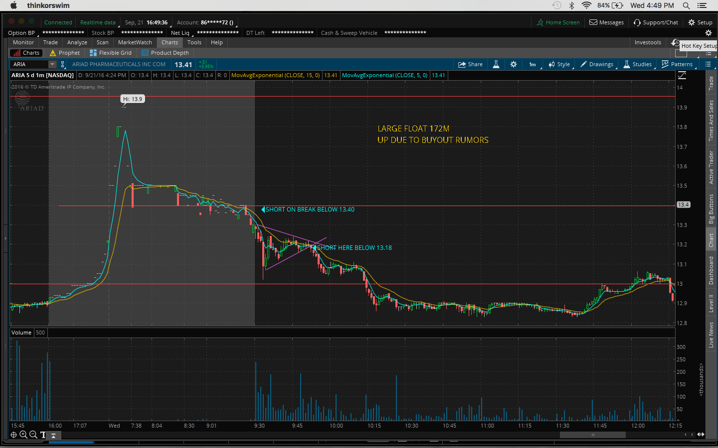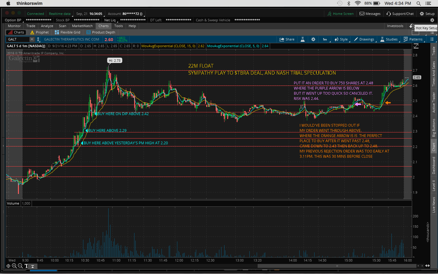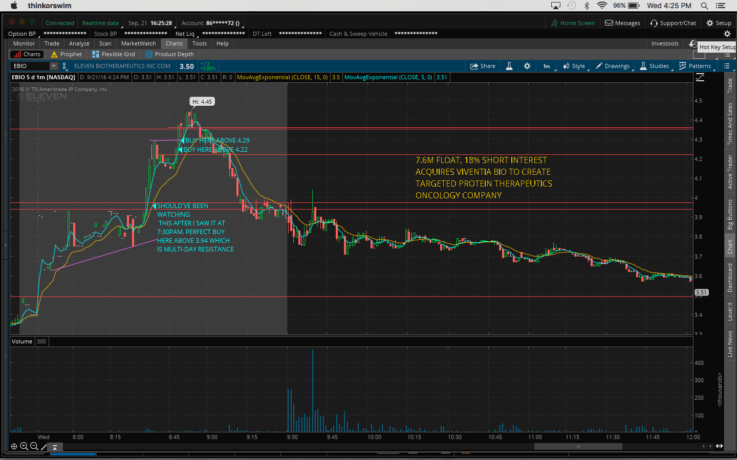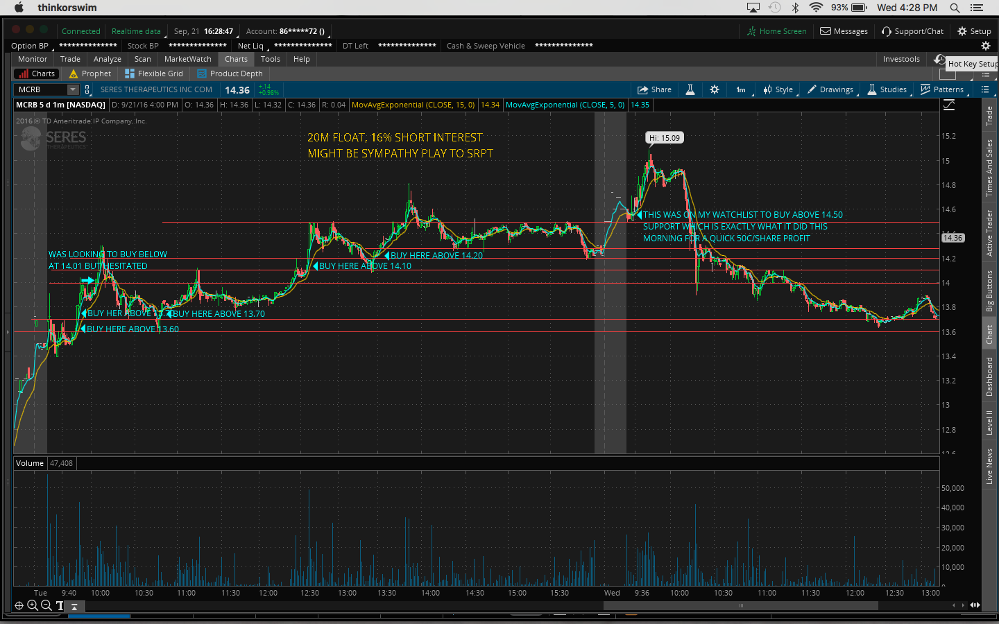 Today I bought $ETSY which was up on an analyst upgrade. I bought 300 shares at 14.31 when it broke the ascending triangle at 14.30. I sold a few minutes later at 14.353 when it looked like it couldn't break 14.38. It then went all the way to 15.00. My price target was about 14.50 so I should have at least waited till it reached that. I even said to myself that if it broke 14.50 it could go to 15.00 which is exactly what it did. So I could've made $200 instead of making $12.90 which after commissions was a loss of $3. I need to have more patience and let the trade pan out. What I should've done was use the initial break of 14.30 as support once I was in the trade. It did drop to 14.25 after which was still above my risk of 14.20. But then when it went past 14.30 again that should've been the new support/risk level so if it broke that and went down to 14.29 then I would sell. Adjusting the risk like this allows winners to run. You can see on the chart that it just kept going up from there and never went below 14.30. Then after that I should've used the 3 min chart to see where to exit. If I did I would've seen all the higher lows up until the 2nd red candle at 14.95. Then my sell would be below the break of that candle at 14.87 when it makes the first lower low (purple arrow). Watching the 5 ema (blue line) would've helped as well as you can see all the candles were above it which means it's still uptrending.