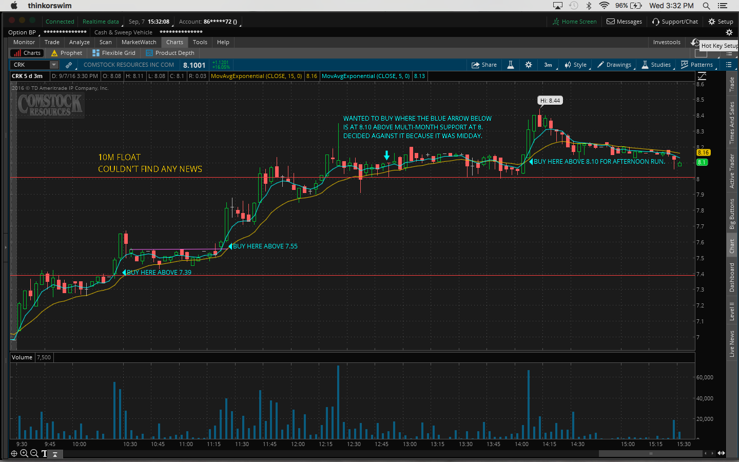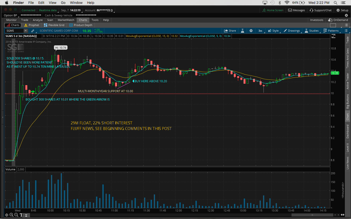 Today I dip bought 300 shares of $SGMS after it spiked from 8.87 to 10.39. I bought at 10.01 above the multi-month/multi-year support at 10.00 on the 3 min chart. There was news but it sounded fluffy "Scientific Games sees notable strength after announcing the company will consider potential JVs, acquisitions, IPO, and other growth options." So this trade was played purely on price action. I was hoping for a retest of the morning high of 10.39 but sold 6 mins later when it looked like it couldn't break 10.15 which was also my sale price. My thesis was right though because 10 mins later it went up to 10.74 so I left 59c/share or $177 on the table if I held till the high.