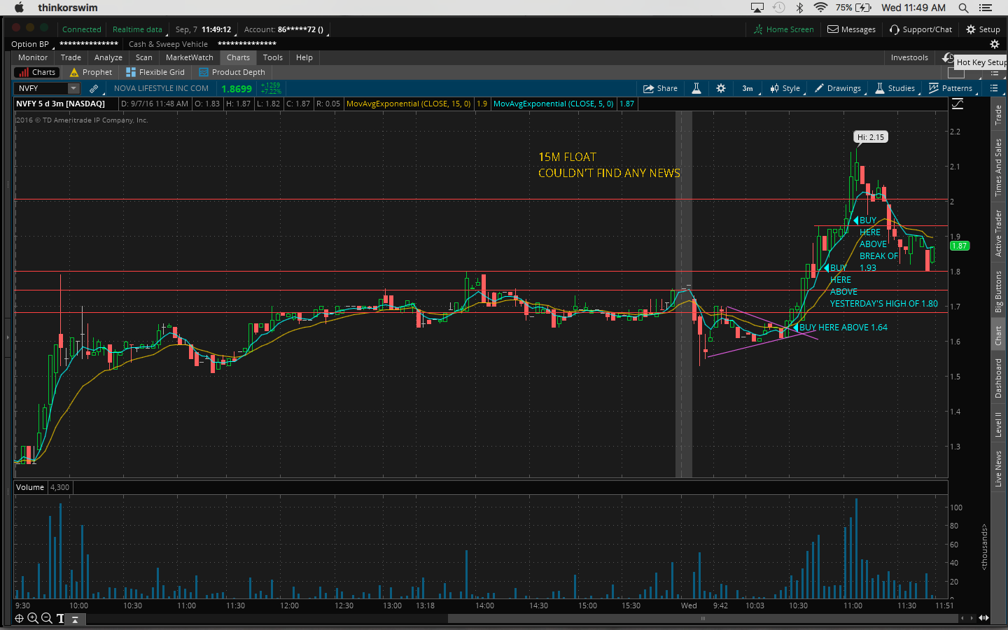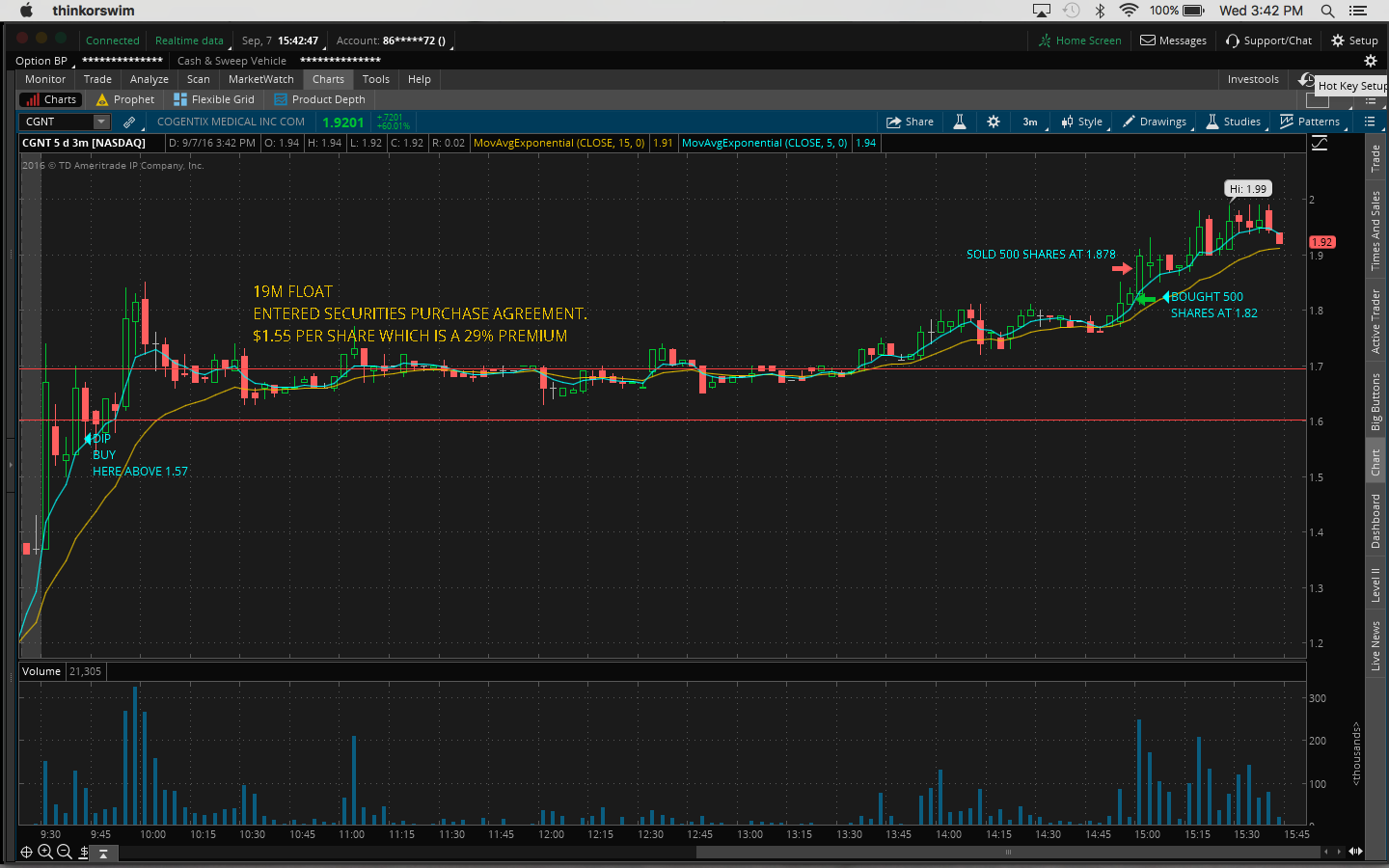 The second trade I did today was $CGNT. It held its gain really well in the afternoon so I bought on the dip after it tested resistance/the morning high at 1.85. I bought 500 shares @ 1.82 and sold at 1.878. Small gain but my entry was good. It got up to 1.99 so again I sold too early :)