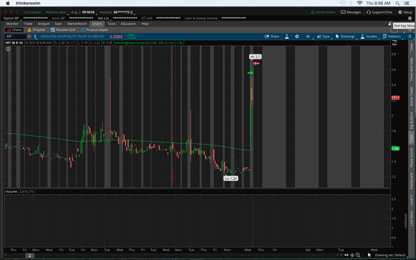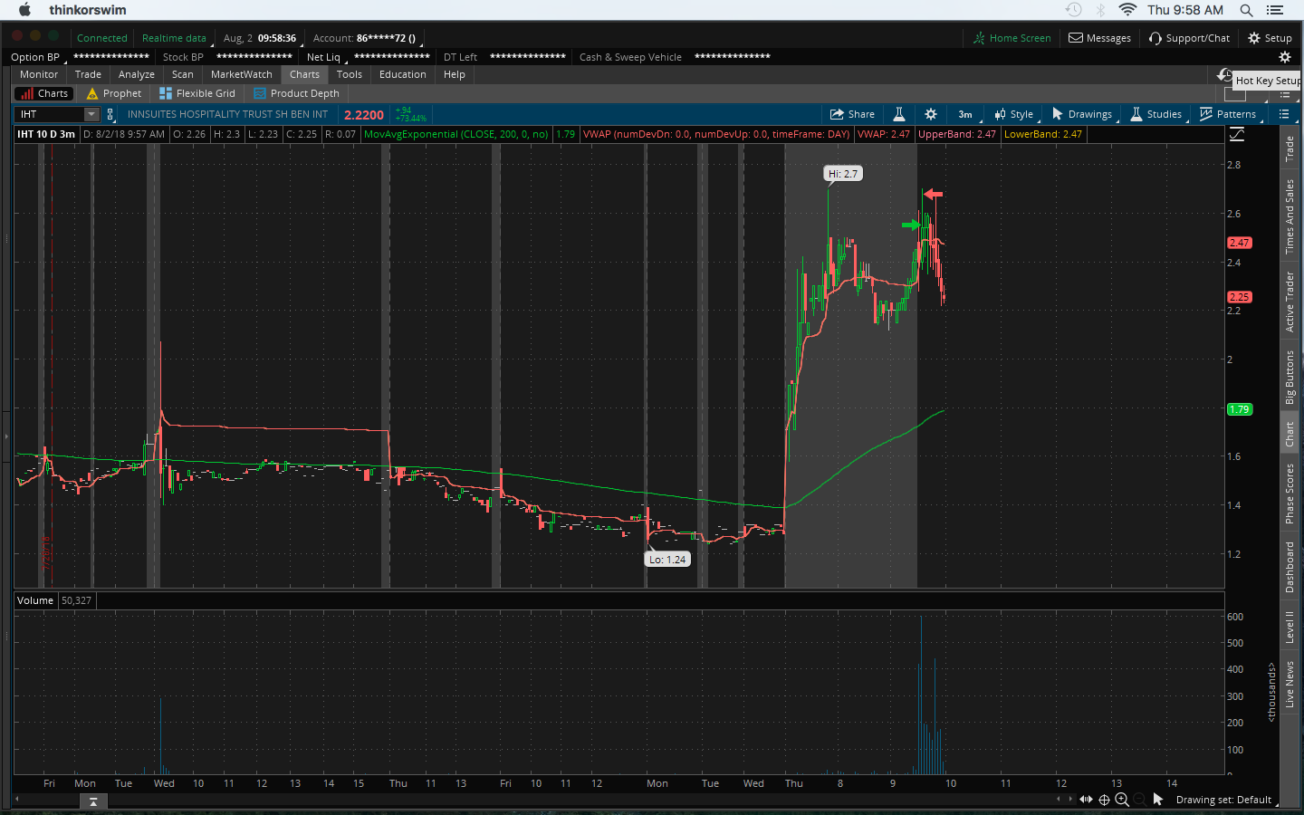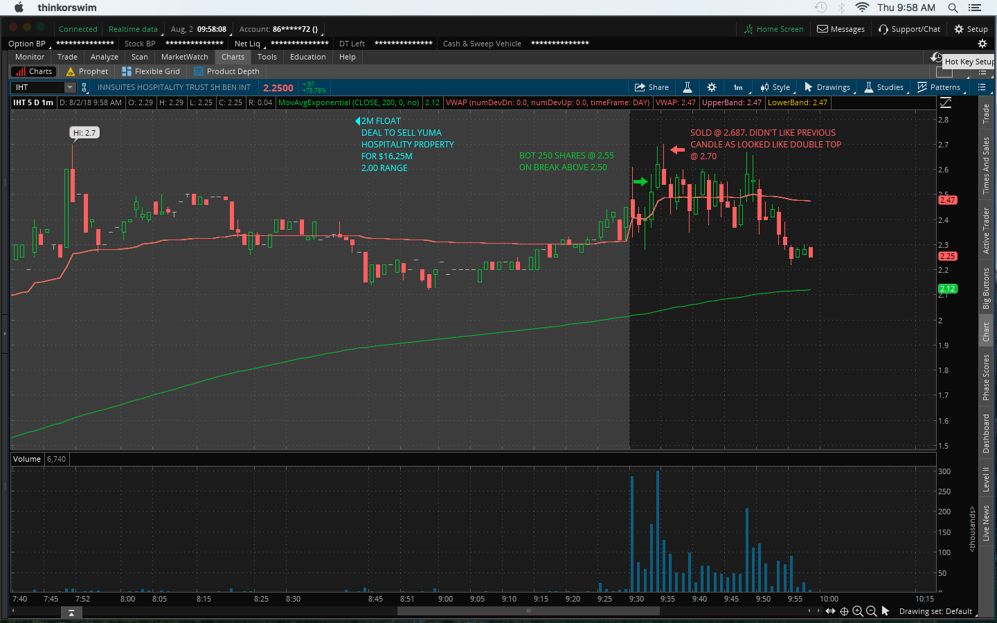 $IHT trade, 2M float, selling Yuma Property for $16.25M, 2.00 range. 13.7c/share win. Bought first dip at open but sold after it double topped at 2.70. Posted Aug 02, 18 10:11 AMbyPandabearViews 140 / 1Related Trades34.25 -- IHTby PandabearReceived 1 KarmaColbzter Aug 02, 18 1:20 PMI paper traded this, played like a morning panick. I got in at 2.03 right where it was consolidating after the panic. Sold at 2.28... solid trade for me.Pandabear Aug 02, 18 8:36 PM@Colbzter I'm too scared to buy dips and you had a lot of patience holding till 2.28. Nice!Join now or log in to leave a comment