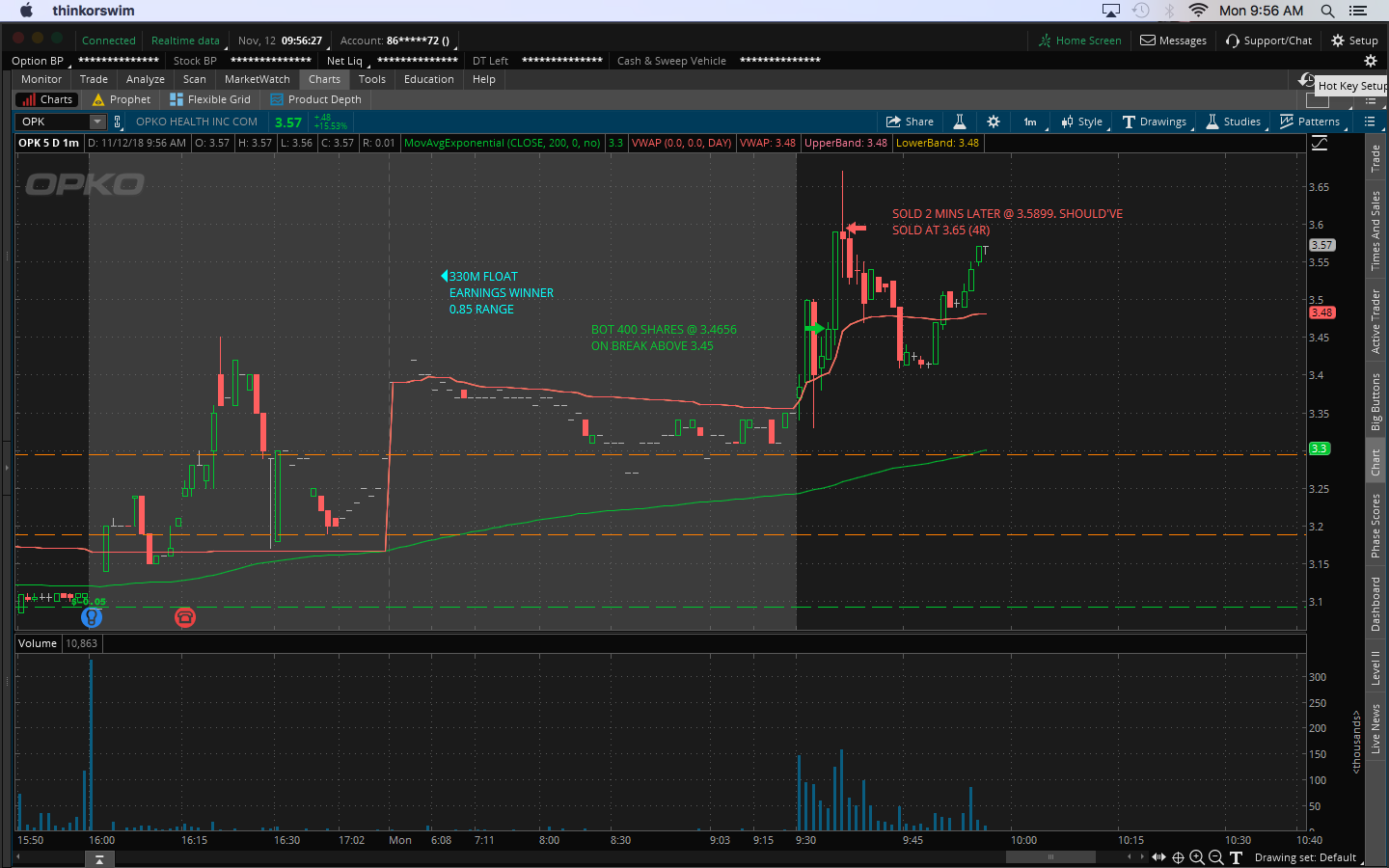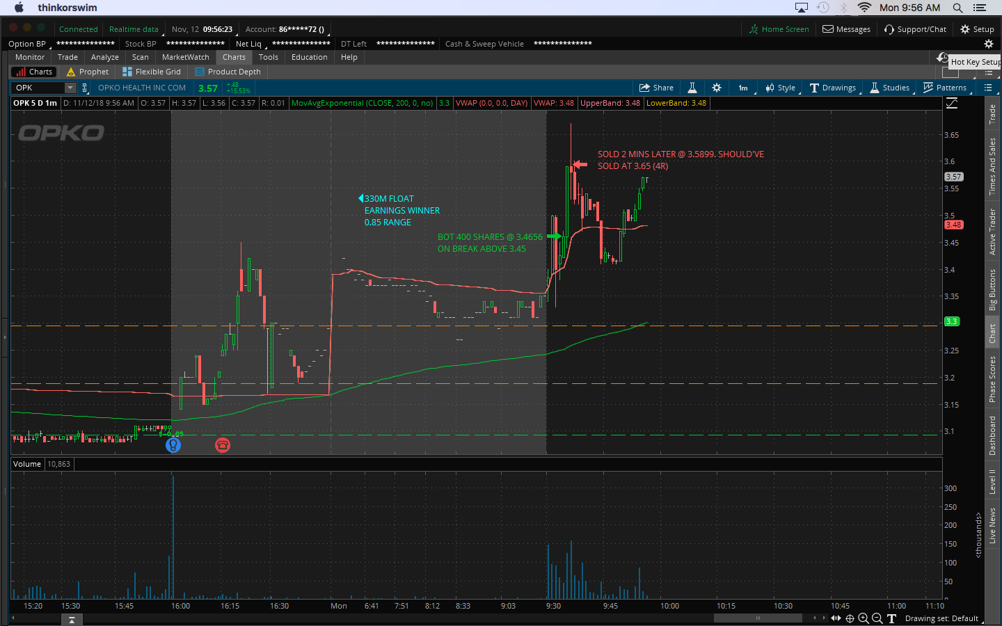 $OPK trade, 330M float, earnings winner, 0.85. 12c/share win. Bought first dip at the open when new high was made. Got about 3R profit. Ideally would like 4R next time Posted Nov 12, 18 9:06 AMbyPandabearViews 239 / 0Related Trades49.72 -- OPKby PandabearReceived 0 KarmaJoin now or log in to leave a comment