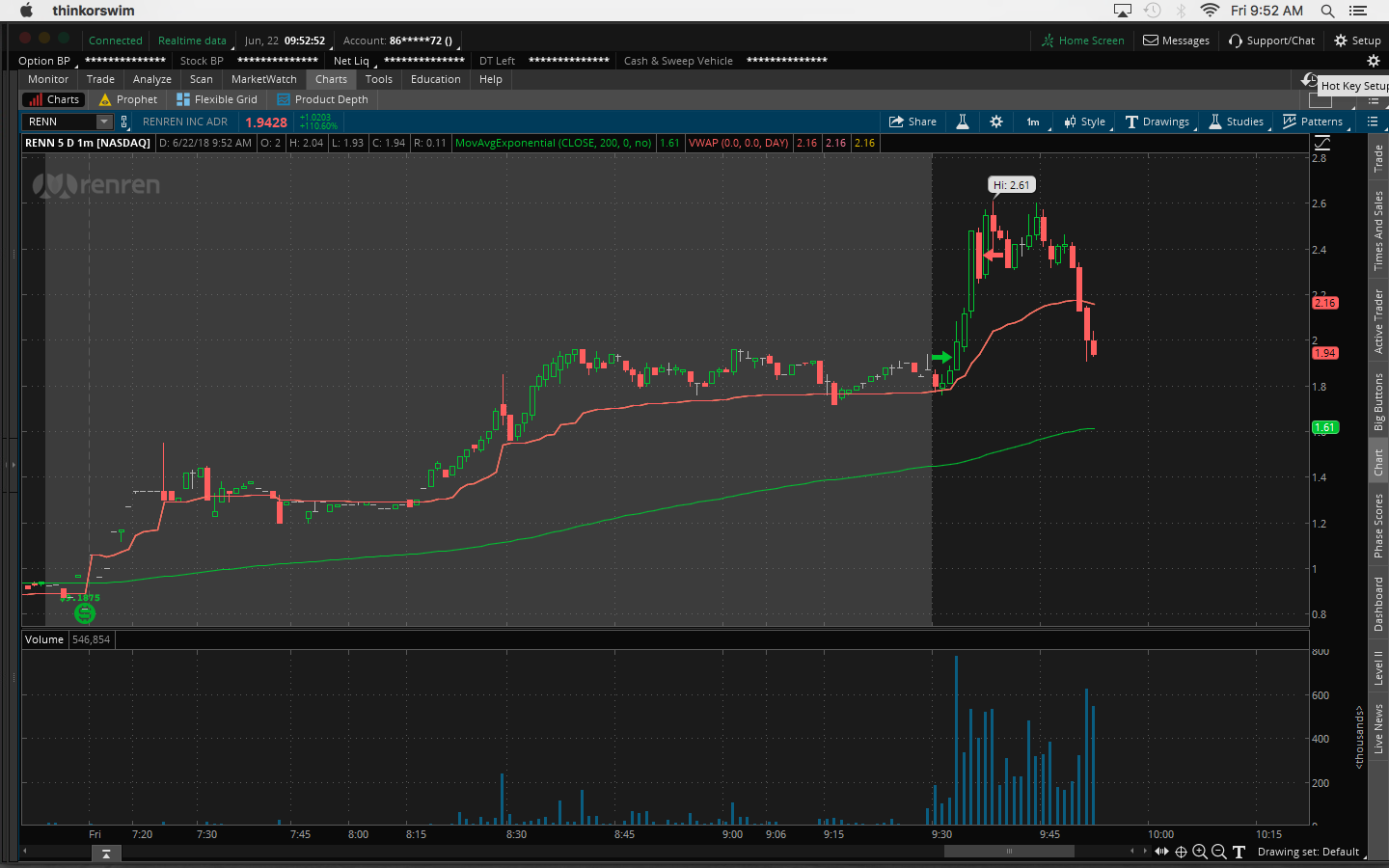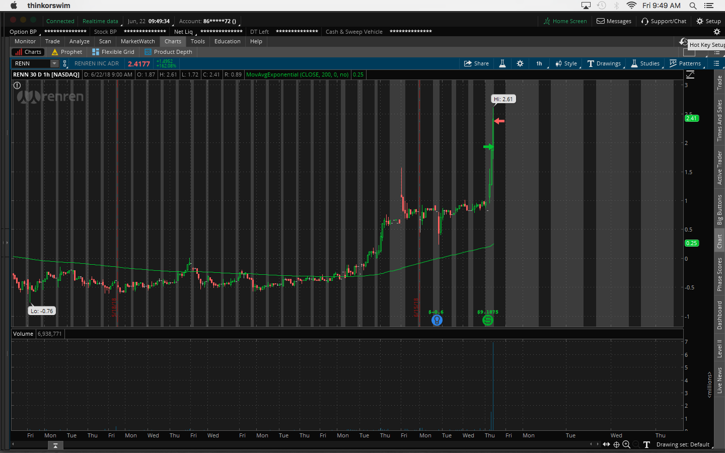 $RENN trade - 15M float, no news, earnings 3 days ago. 45c/share win. Was aiming for 50c/60c. Got close but got a bad fill, still 23% win in 3 mins. Posted Jun 22, 18 10:24 AMbyPandabearViews 285 / 0Related Trades136.14 -- RENNby PandabearReceived 0 KarmaKody Jun 22, 18 11:51 AMGreat trade I was watching for a similar move but turned my eyes towards another ticker.Pandabear Jun 22, 18 1:56 PM@Kody Thanks!Join now or log in to leave a comment