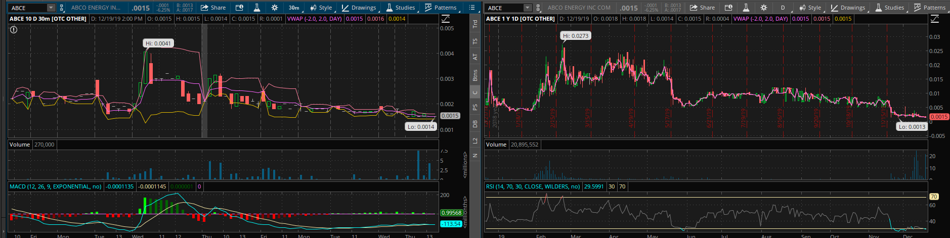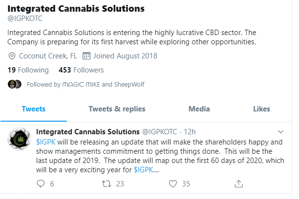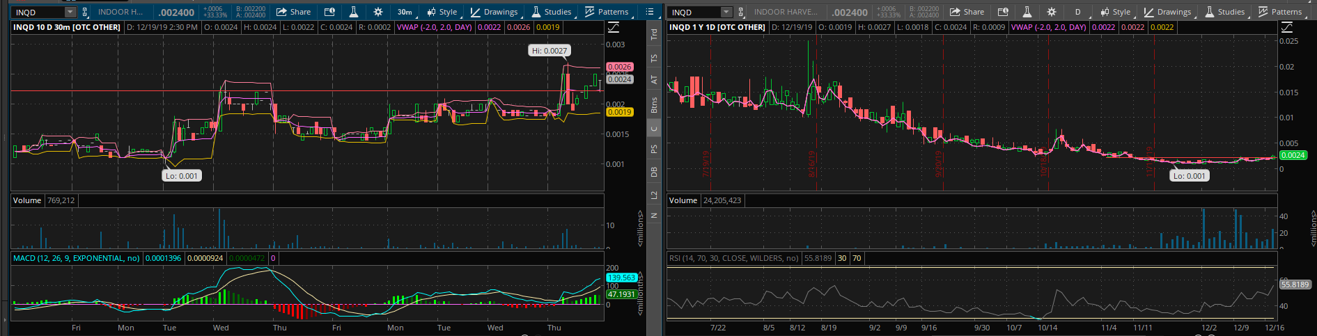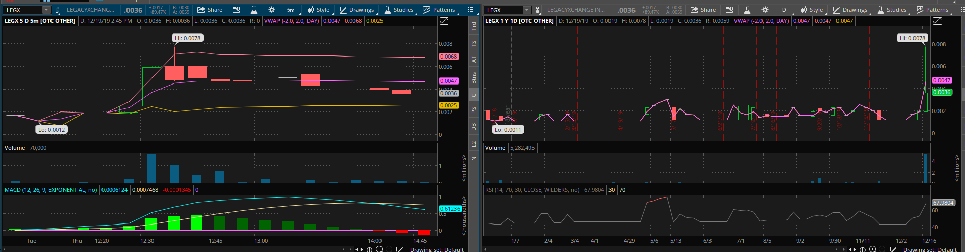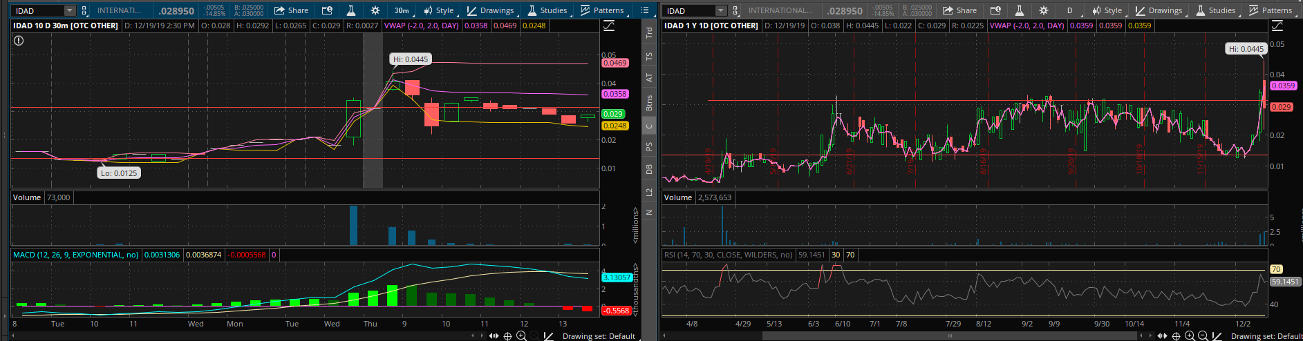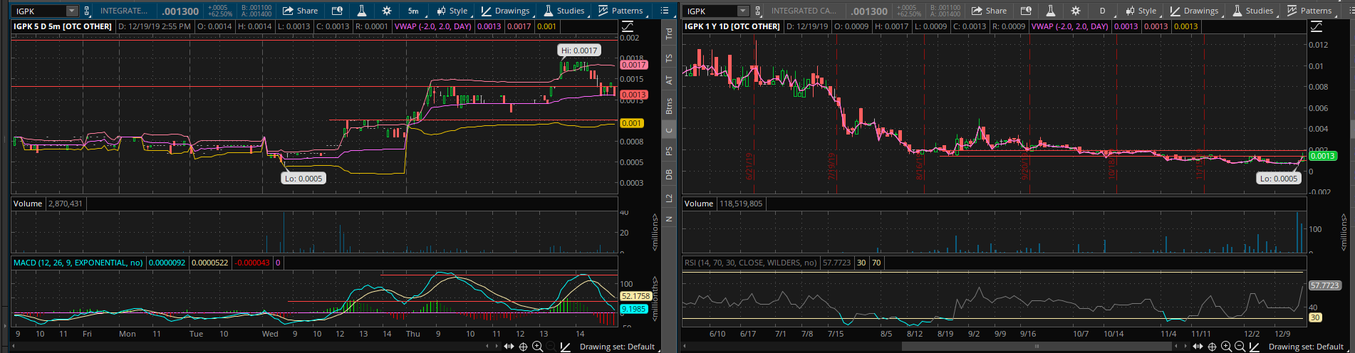 This was on my watchlist yesterday because I saw some unusual buying on Wednesday. And for a stock that was trading 0.0008 the share structure did not look that bad. I feel the company was front loading. Apparently some other traders saw the same thing. IGPK went over 100% today and ended up at 62.5%. I decided to pick some up at 0.0012. The company tweeted today that they will present news 2020. What I know about OTC traders is they like anticipating the news & they like to swing without worrying about bad filings coming out. You buy on the rumor and sell on the news. Like WSGF was moving the past week because of the rumor and the news came out today and there was selling like crazy. So I'm thinking about swinging this but will sell before this year is up or huge selling.