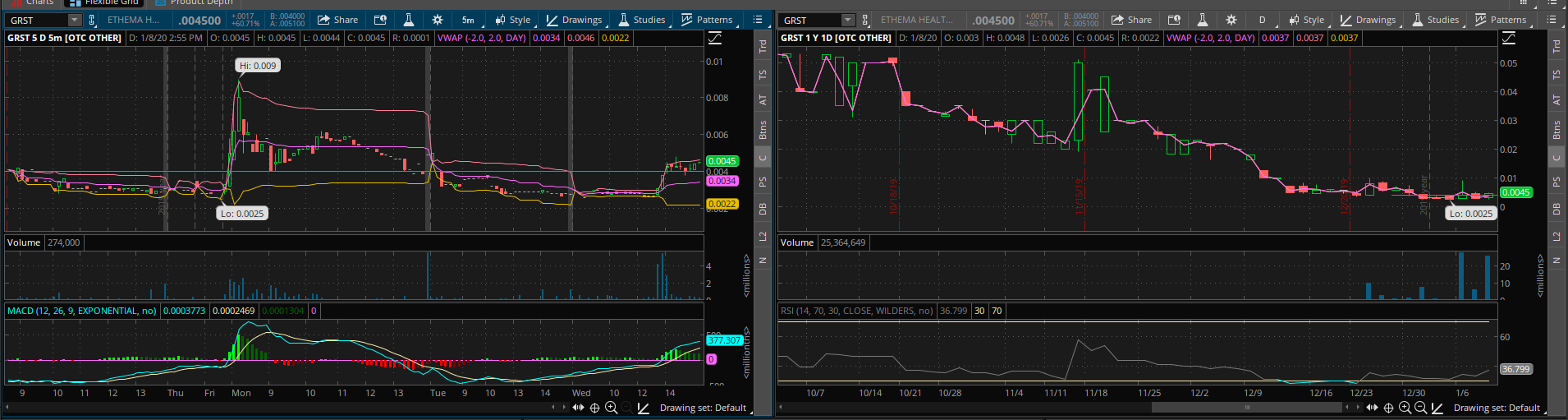 I did buy this stock and held O/N. Contrast UNEQ volume with GRST. As GRST ended the eod, there was less volume but this stock went up. $83K in less than 15 minutes which is big in OTC world. Could this be a sign that it's running out of shares? Lets be realistic though. GRST has an A.S. of 900 million. They have bills to pay and they have notes. The #1 offender is PAUL. For those who read level 2 in OTC we know that dilution allows debt holders or company insiders to sell shares into the float. Most retail traders like you and me will read "NITE" "ARCA" "ASCM" etc etc. Dilution trades will read "CFGN" "JANE" "MAXM" etc. etc. In this case, watch out for "PAUL" Dilution is part of OTC. The question is, will retail trading volume overwhelm PAUL? It's the risk I'm willing to take. What I see is less volume at the end of the day and the stock is going up. Could they not convert fast enough? I will watch it and trade it on the 5 minute chart.