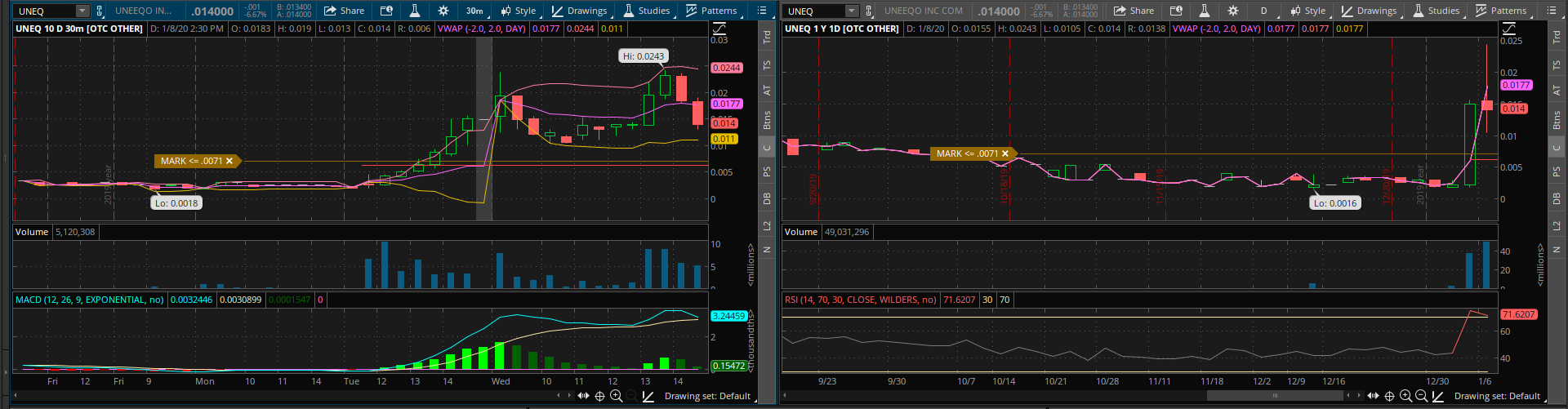Yesterday I had UNEQ on my WL b/c it went to over 500% in one day and had I stayed with my plan, I most likely been profitable. But I'm back to PDT on this new account. Is UNEQ worth a daytrade? It has zero assets, moving on the fact that it's crypto, and BTC went from green to red. I have seen the stuff on social media... "it's got an attorney letter coming out AH." From my experience, attorney letter is not a catalyst. Attorney letter comes out all the time and it doesn't move stocks. And I read the UNEQ attorney letter AH, and it basically says nothing except that I'm an attorney. What I don't like about UNEQ the most is reading the level 2. There's increase volume in the afternoon but the price went down. You are welcome to trade it, but I'm not in it. I did set an alert under 0.007 to review it.