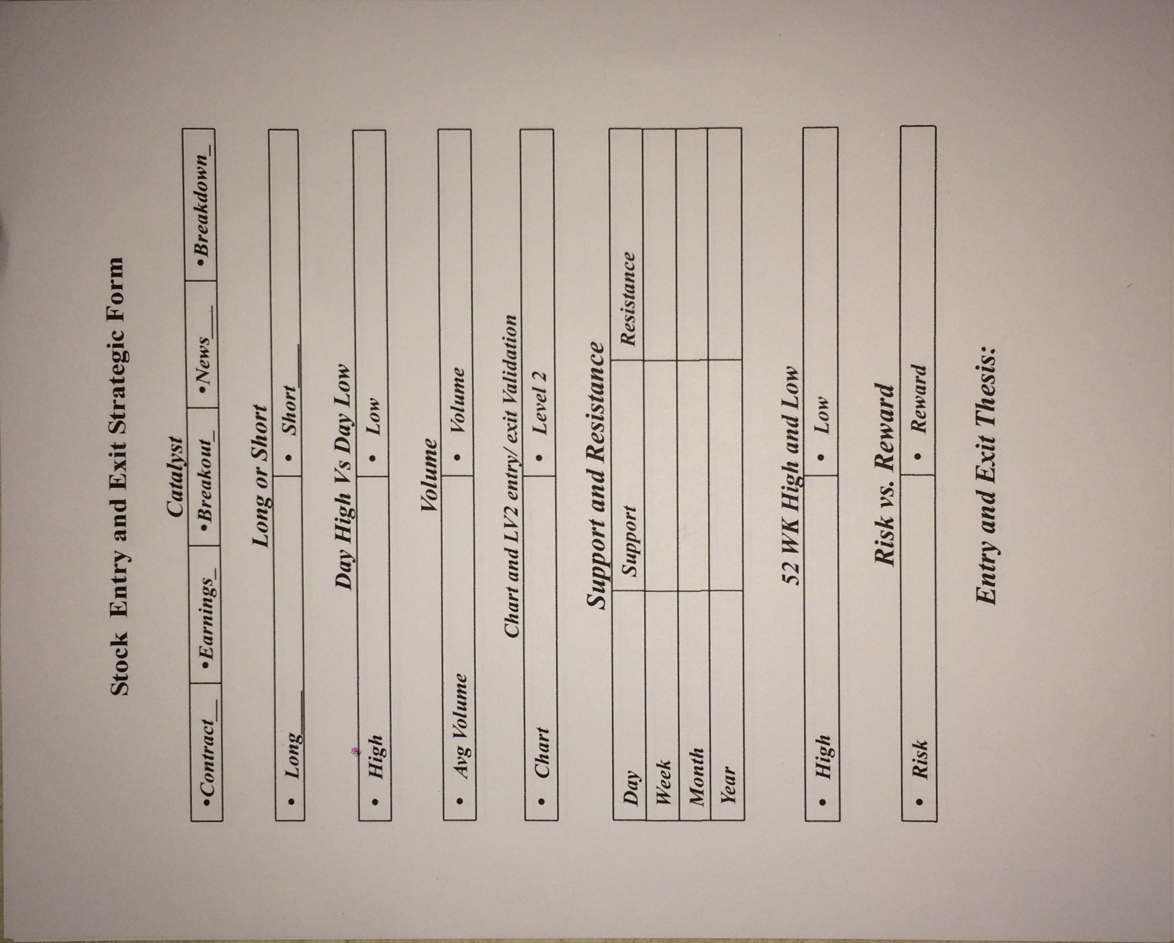 Stock Entry and Exit Strategic Form I created this form to help me out, i got all the basics on it. I decided to post it in case it can help anyone out. Posted Jun 06, 16 9:01 PMbyPhdGamerViews 320 / 1Received 1 Karmadima1988 Jun 06, 16 9:39 PMGreat Form. I appreciate you sharing it with the community!SGayle Jun 06, 16 9:40 PMThanks for sharing this!Join now or log in to leave a comment