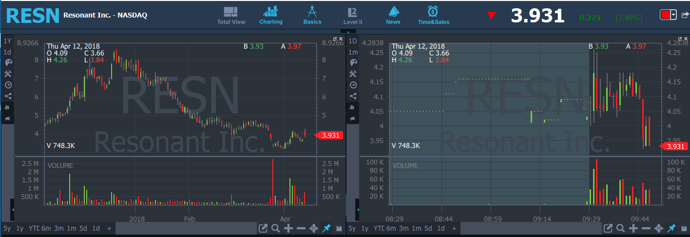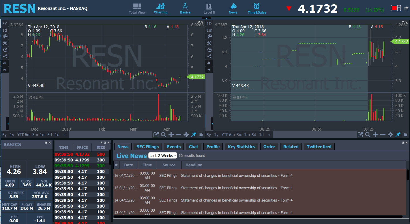 9:39AMTimChallenge timothysykes [Trade] Bought 3000 shares $RESN at 4.07 - I bought this former Supernovas on rumored deal with Samsung, goal is to make 10-20%, cut losses quickly if no pop since its just a rumor (3)