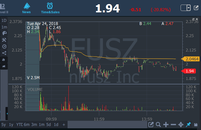 9:33AMTimChallenge timothysykes [Trade] Bought 5000 shares $FUSZ at 2.06 - I dip bough this low volume morning panic, goal is to make 5-10% bounce (5)