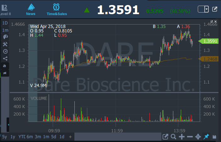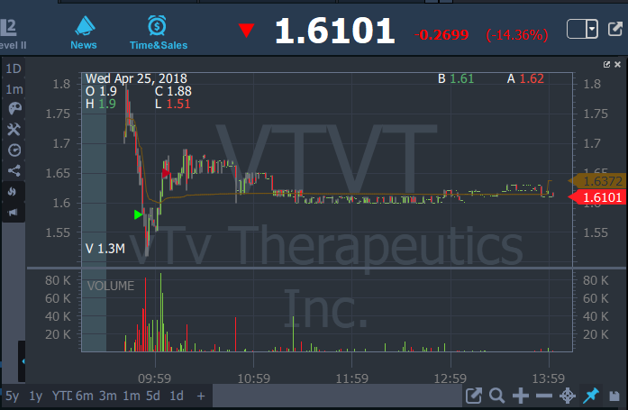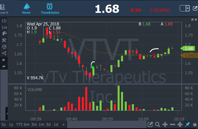 10:17AM - dip bought some on the mini morning panic @ 1.58 and sold later in the 1.65 for a tiny gain. Looks to be holding the 1.60ish level pretty well and it might go higher but I wanted to play it safe and take the profit. Looking at level 2 now and I should've probably held since it looks to be going higher now. It's all good though. Safe and profitable trade here. (5)