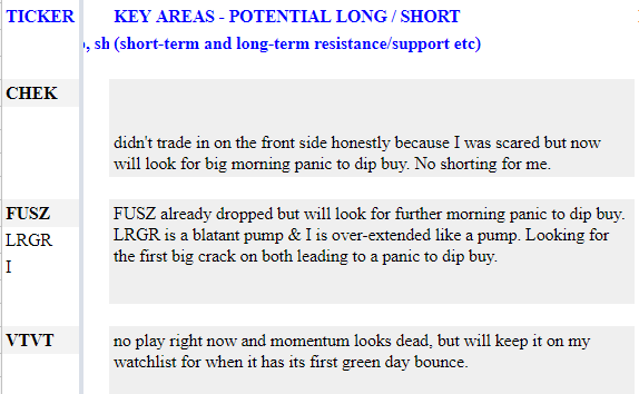 2:26PM - this one was traded by a lot in the chatroom because it was a p/m % gainers. However, I did not see it due to STT being down, but I'm not sure that I would've played had STT been working. Although I do see why people played it. This is Roland beaten down stock that bounce when volume comes in. This had news and is a low float so the upside was there even though it wasn't much. Intraday price action is very choppy though. It might be an o/n hold if it holds strong but there is a risk of an offering coming out since there have an $8M deal ready. So I just watch and learn from it for now. (10-11)