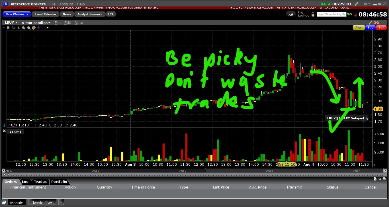 $GPRO was a good lesson in that for the higher prices stocks things happen a bit slower so my quick exit was a bit off although no real harm done. $LBUY crashed nicely and offered a good dip at 1.90ish level which I couldn't take but I tried just couldn't execute due to the pattern day trade rule. I have included both screen shots and thanks to Tim for really helping us newbies with a pre market open video highlighting the dip buy area was extremely helpful :).