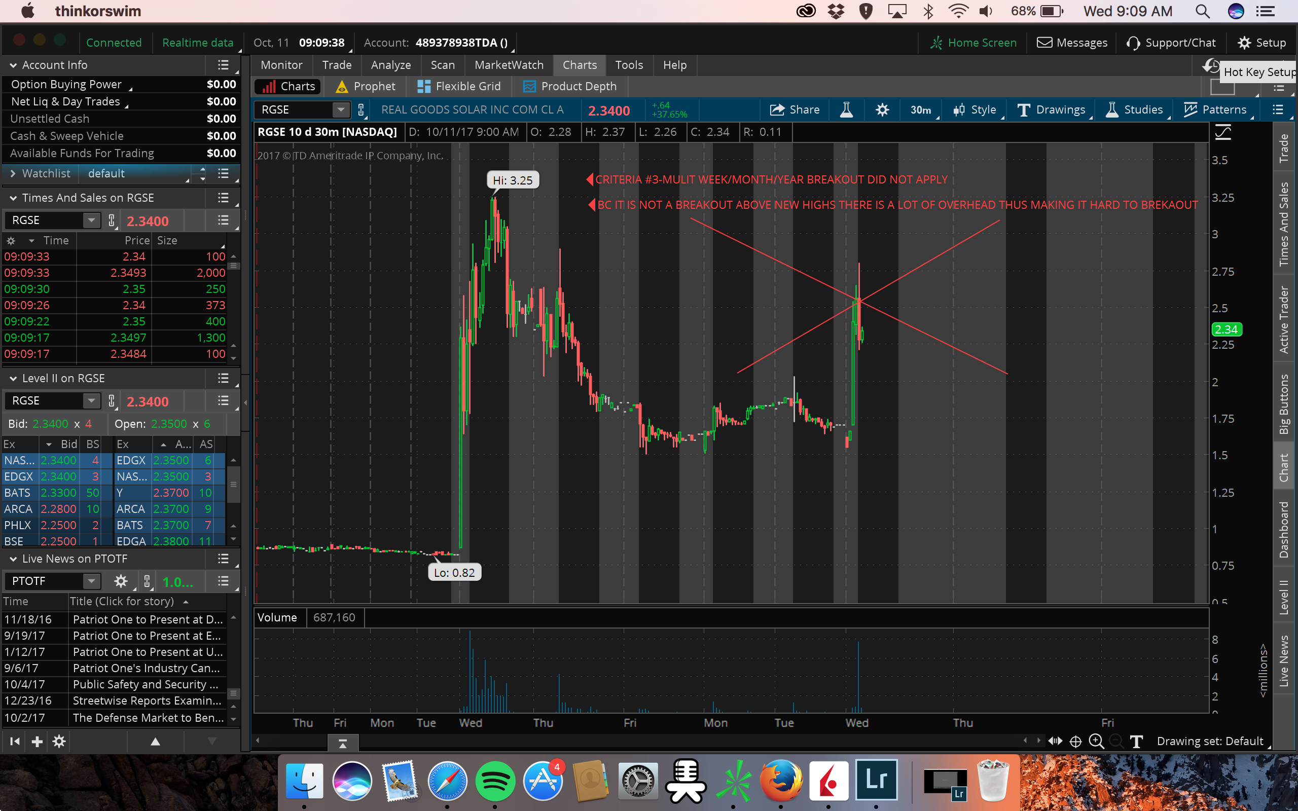 Rule #3 for Grattani for buying breakouts is it has to be a new multi week/month/year high. If you try buying it before on the run up in anticipation for the breakout, most likely you'll get stuffed because there is just so much overhead resistance. That's what happened today with me on $RGSE. It had almost all the criteria needed: low float stock, high volume; BUT...it did was not a breakout over a new high. It was leading up to a new high and only breaking out over the past 3 days.
