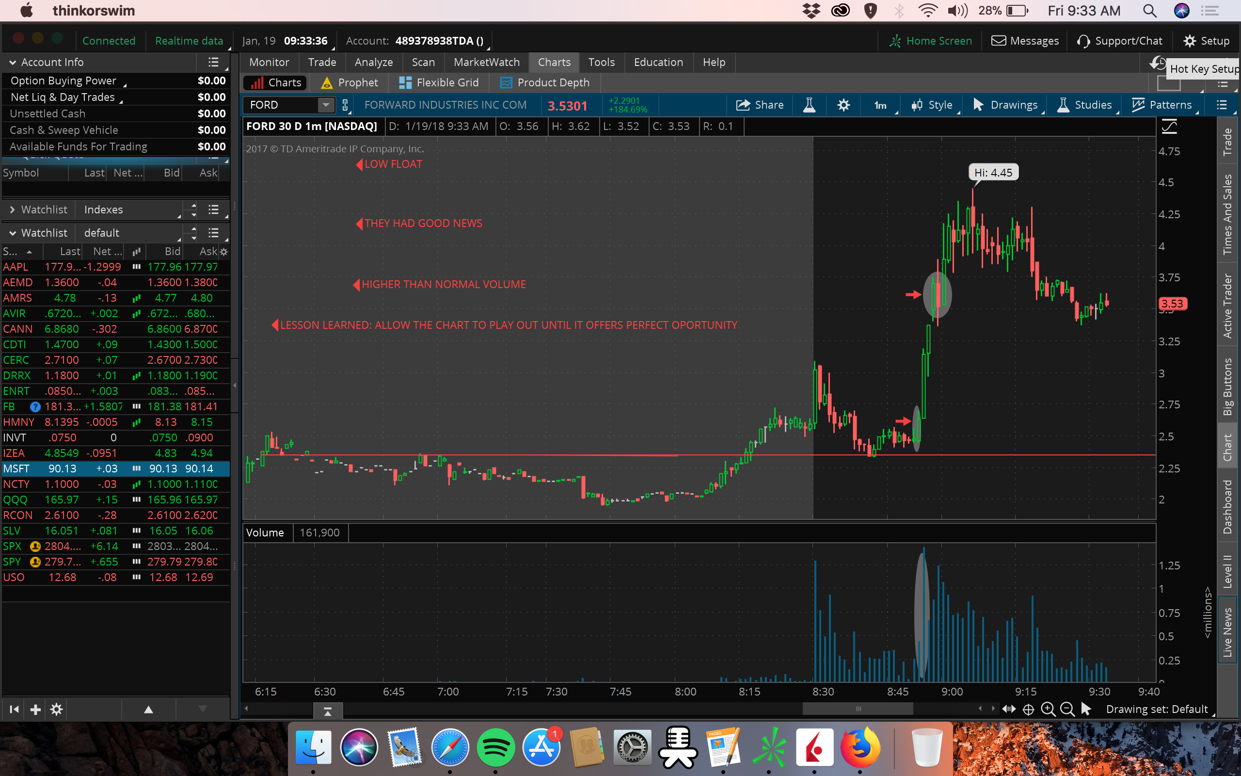 Like Roland has said, let the chart play out for the first 10 minutes or so, in order for the chart to be able to tell you where to get in. In this case with $FORD, if I had been patient, and not bought in too quick, i would've seen the higher low, thus, the opportunity to enter in. I was in too soon and sold when it dropped below my 2.50 risk level. Now in one hand its good that i respected my risk, but in truth, it is wiser to allow the chart to prove itself and show you where to get in. Patience would've allowed this, but i have to take the small loss and learn. Be ready next time.
