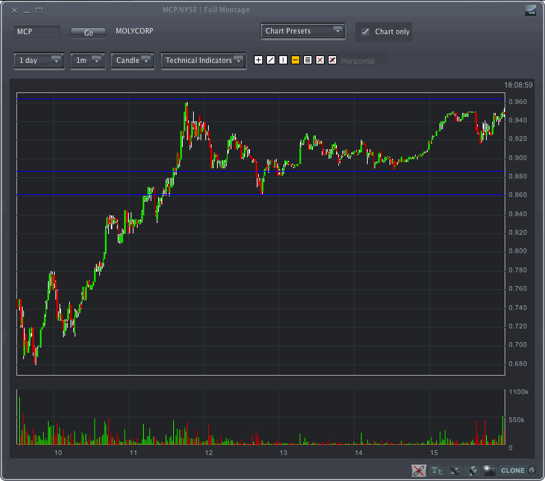 I bought it at 0.90 right around 2:45pm after it held support around 0.89 - 0.88 because I expected it to squeeze. The reason why I was thinking that it was gonna squeeze is because not too long ago they put out a press release saying that "They might not be able to stay in business" back around March 18th. So I looked on Yahoo Finance and looked to see how many shares were short and it showed 31% or 57M shares short as of March 31st and with this information I would bet that a lot of people think this company is short lived.... but then $MCP won a contract that stated that they will be supplying "Siemans AG's wind turbine generators over the next 10 years" which in my mind makes me think that they probably aren't going to go out of business. That's when I bought it at 0.90 but the quick little pull back faked me out. But that's my thesis...