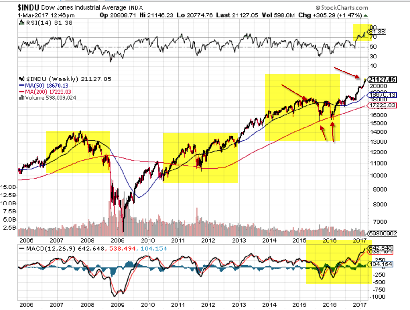 Right now, the Dow, S&P, and NASDAQ are way over valued and hitting record highs. Before each major pullback you have unprecedented optimism and full steam ahead. Trump provided the catalyst of late and after last night's speech did not give any reason for the markets to change their up trend. However, look at how scary things are from a technical stand point. Think if you were buying $INDU right now. Is it a safe bet or is it time for a pull back.