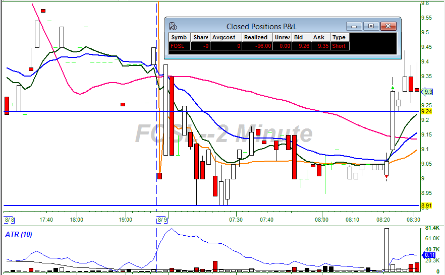 As soon I launched my trading platform; the first ticker I pulled up was...you guessed it FOSL and I tried to get short almost right away! However, my order was rejected as it was 7:47am and my broker (SureTrader) does not allow pre-market trading until 8:00am.