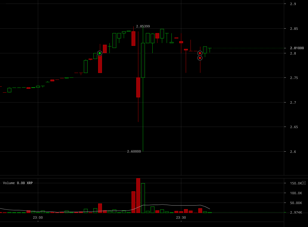 Apparently I did have the mind to grab at least one screen in here so we can time travel with more accuracy on this one at least. Here's what that second XRP trade from the shot above looks like up close. Pretty obvious why I got right back out of that one. This chart is way brighter cuz I didn't run it through windows paint to write shit on it.