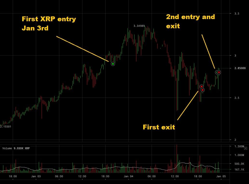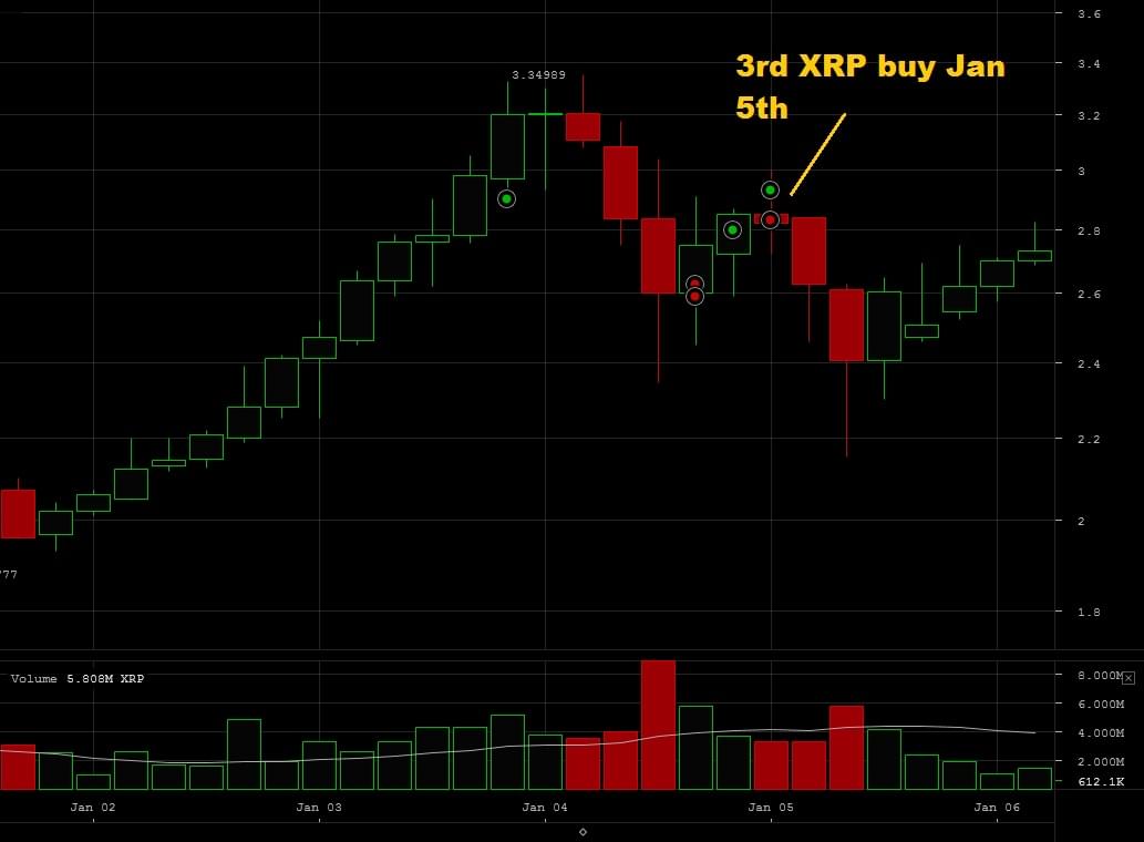 January 3rd 2018 at 10:06 pm I got into the Ripples again. I had a great entry at $2.90 right before a run up to the $3.30's. It looks like I thought XRP might have strength to keep going up over night so I left it. It also Looks like I didn't get the chance to check on it before work the next day. By the time I got home I was at a loss down to $2.61. Bought back in a couple of hours later at $2.80, scared out again 20 minutes later at basically the same price. Almost exactly 59 minutes later (now into Jan 5th).....you guessed it back in again at $2.93, out at $2.83. That last trade does not appear on this chart.